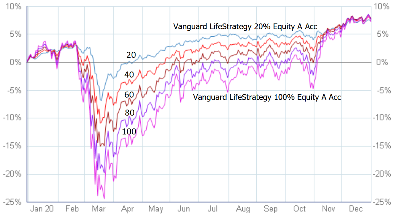 I researched historical data for a wide range of funds and concluded that whilst more volatile funds went down further in a crash, they soon recovered and then outpaced their cautious siblings. The above seems typical. That’s why I bought into more volatile funds.0 -