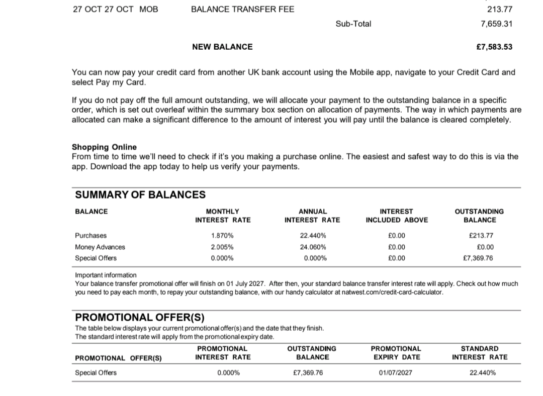 Fortunately all resolved today. I contacted NatWest after they added interest to the balance. I still have no idea why. Then at times told me I would get charged interest on the purchase balance. Yikes! Then I found the small print. No interest payable. Phew.