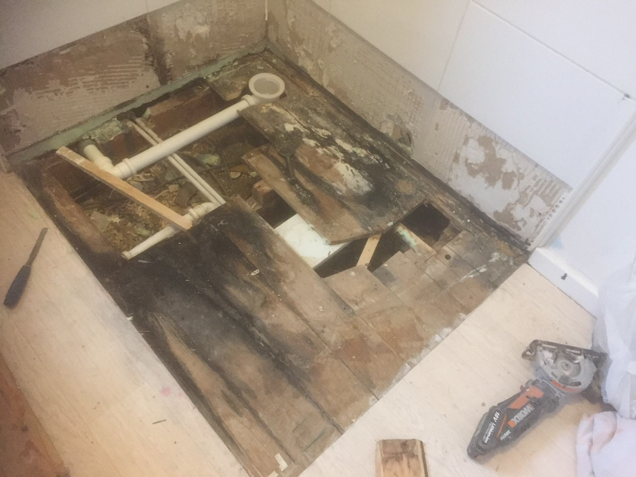 LouSmith11 said:...My argument is that if it was so easy to diagnose the joist as being the cause of the leak just by looking at the installed shower why could they not do that before they installed this one? The leak seems to be coming through in the same place in the living room. We have a photo we took of the flooring after the previous shower was removed, there are floor boards missing, they did use three sheets of ply under the shower tray but if it is not supported equally it may well cause an issue. There is also not much of a gradient for the waste pipe....Surely it is not unreasonable to expect any competent bathroom fitter/installer to realise that if there are missing floorboards(!) where the shower was previously, then there is quite a serious problem to be addressed? ie properly investigated and remedied before going any further. I'd hardly consider three sheets of ply sufficient.