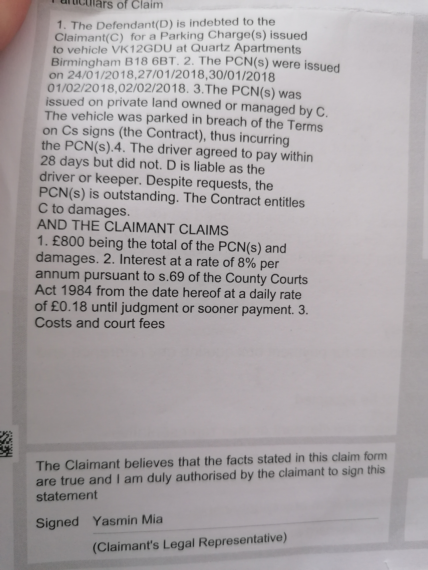 That was a different PCN but you can certainly mention it.How is the ridiculous sum of over a grand arrived at?!Court claim says its the cost of the PCN's and damages.We know that, I was asking for the breakdown please. We want to know how much is PCN and how much is fake debt recovery/damages, and interest.PRIVATE 'PCN'? DON'T PAY BUT DON'T IGNORE IT (except N.Ireland).