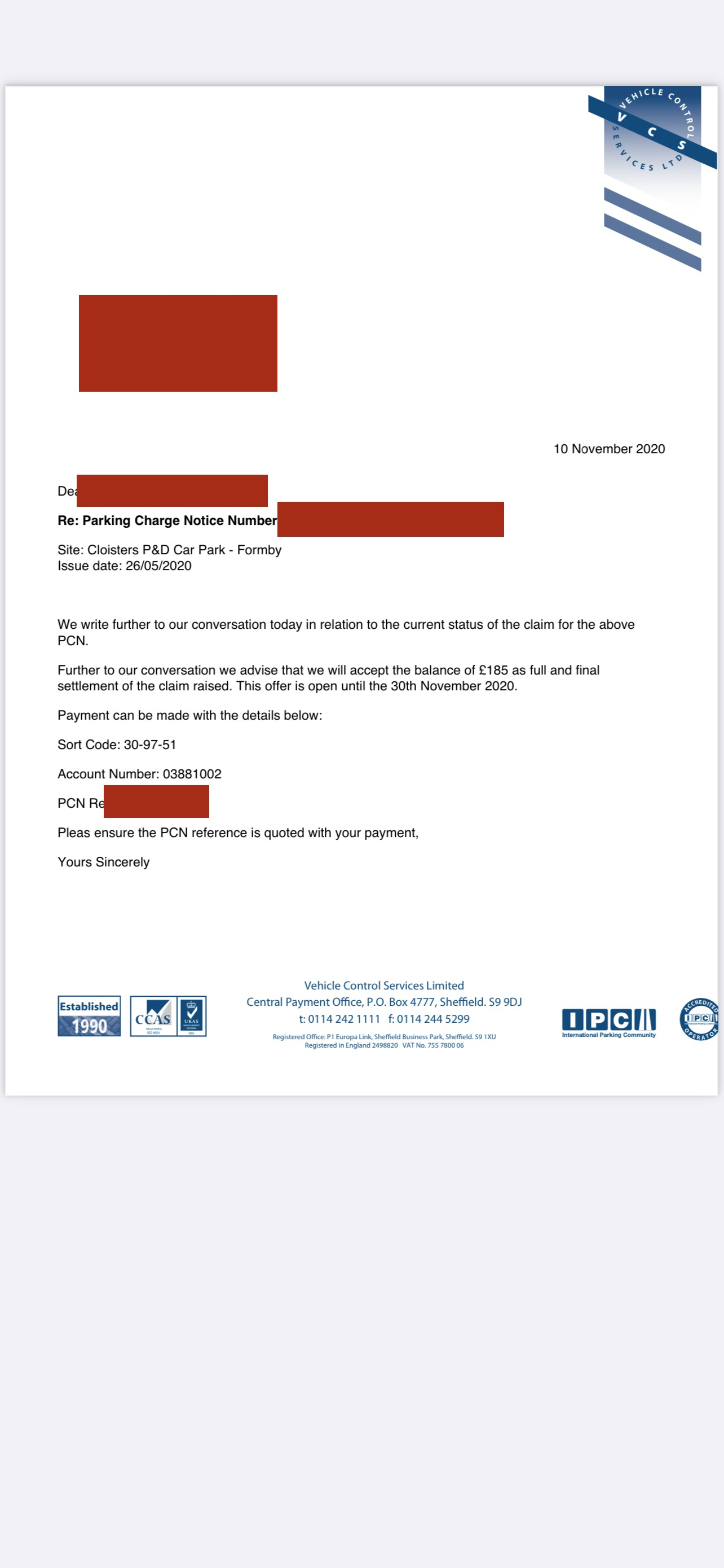 Then in late October I received a court letter and a bailiff letter, in shock I called the company again and was lucky enough to speak with the same advisor from previous who recognised my chasers and requested a manager call back. I then received a call back from a manager in mid November (I had called many times in between these dates chasing the call back) who advised that my original appeal had been declined and that I should have received an email. I explained that no such email had been received however he advised as there had been no bounce back I must have received it and if not that is not VCS issue. I asked why this had not been communicated to me during any of my chaser calls or emails (which had all been ignored) and why I had been advised to ignore the further letters received and he said they are not obliged to respond or confirm further once the decline email has been sent?? He advised on the call that my case was now with a 3rd party and a ccj in place. After a lengthy and emotional call he agreed to pull the case from the 3rd party (elms legal) reduce the fine to £185 and in his words “bring the matter to a close” which I presumed included the CCJ being set aside. He then emailed me a letter confirming this which gave me till the end of November to pay via bank transfer which I did and I presumed that was the end of the horrendous episode.