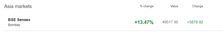Although it's obviously not correct (a shame), Sensex has been on some kind of mission since April with the index almost doubling since its low point, posting a circa 20% gain for the past 12 months.