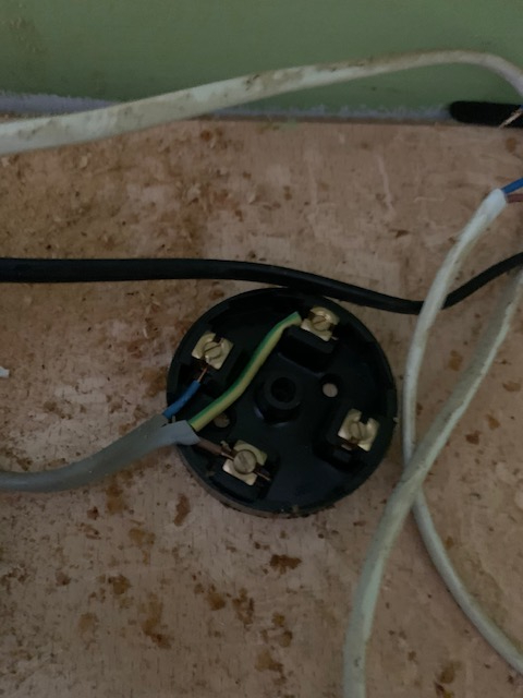 I had to cut the wire from the old one to get it off the wall (after isolating power at the breaker!). The old wire had been run in to a channel in the wall and then connected to a box on top of a kitchen cabinet (to the right) that is in turn connected to an FCU below on the kitchen wall. The old wire is two core (blue and brown), no earth. I've attached some images of the arrangement.