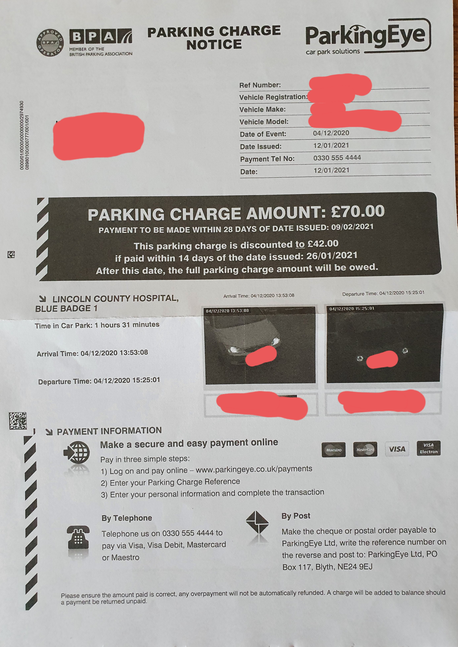 Help needed please. I received a pcn at a hospital, which offers free parking if you register your blue badge at reception. I already did this the previous year but because I'd renewed my badge, same reg no. they said it wasn't registered. I received 2 fines over 2 days as I was sat waiting in my car, as I was taking my mum for her appointment. I paid the 2 charges as they said I had not registered, but now they have sent me a 3rd one for the same day which I have already paid because I left the car park and came back in.
