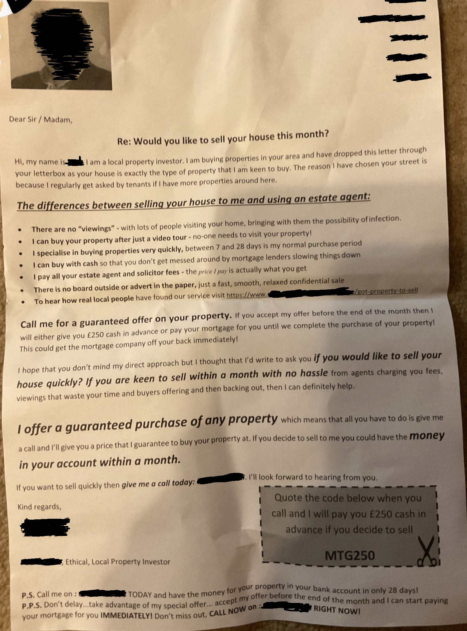 Hadn't considered that angle, but it is very clearly targeting the vulnerable either way. I'm going to sound very snobby now, but one of the things that struck me on getting it through the door was that we are in a very comfortable area with 100% owner occupation, most of whom are retired so I would assume financially stable (given they have retired from whatever vocation allowed them to buy here). Also pre-lockdown houses were typically SSC within 2 weeks to a month. So the offer within a month isn't so special, though what is happening currently I don't know.Curiously worded flyer - note they're not actually promising to complete a purchase within a month, just that you'll have £250 "or pay your mortgage" until the sale completes. I wonder if that means e.g. sticking their tenant in the property while it's still owned by you (which is one of the dodgy schemes going around).0 -