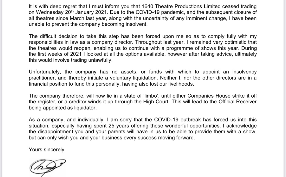 Thank you all. They are still active on companies house. This is what they have sent us , I’m guessing the thousands of pounds are lost even though they should still have our money as they haven’t paid the theatres yet as they were closed ?