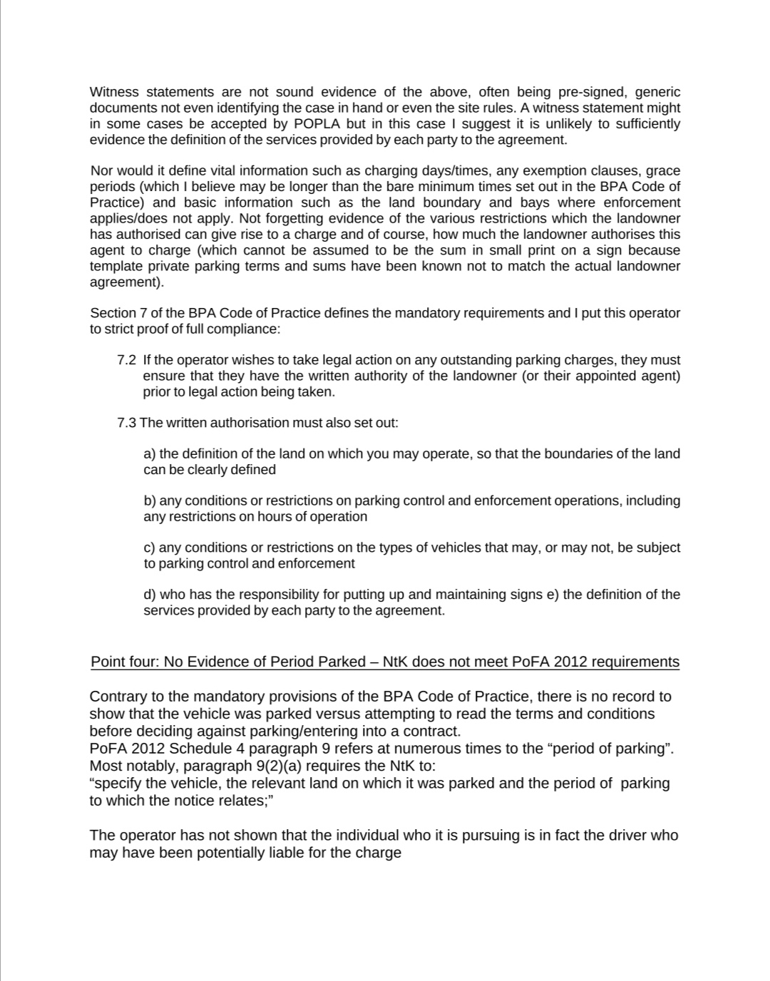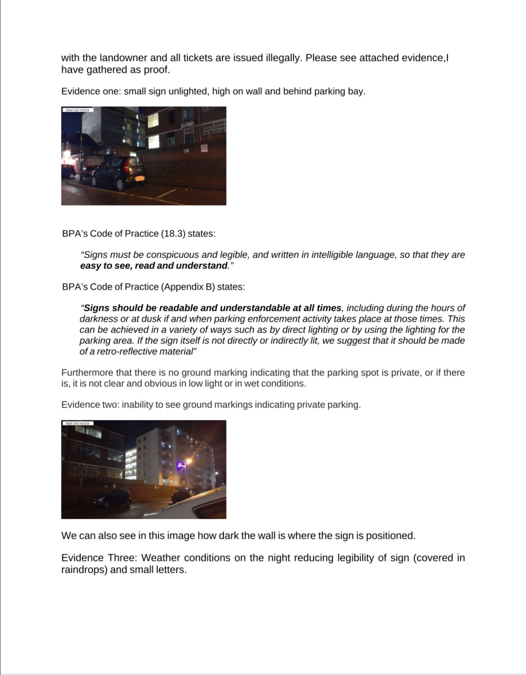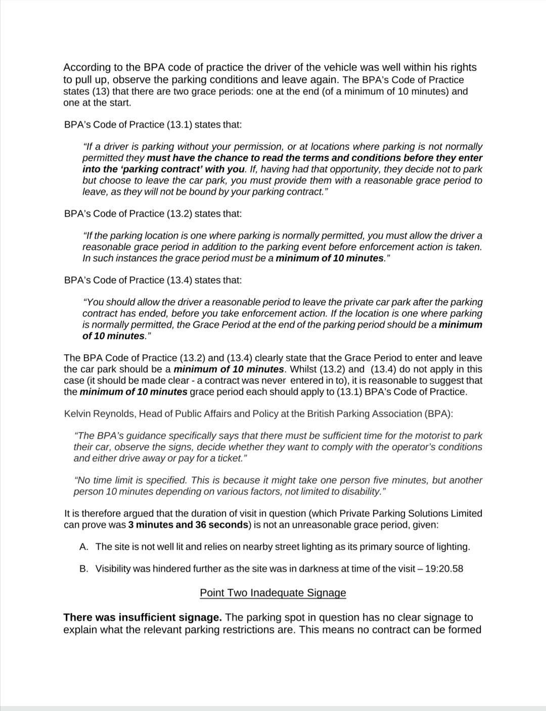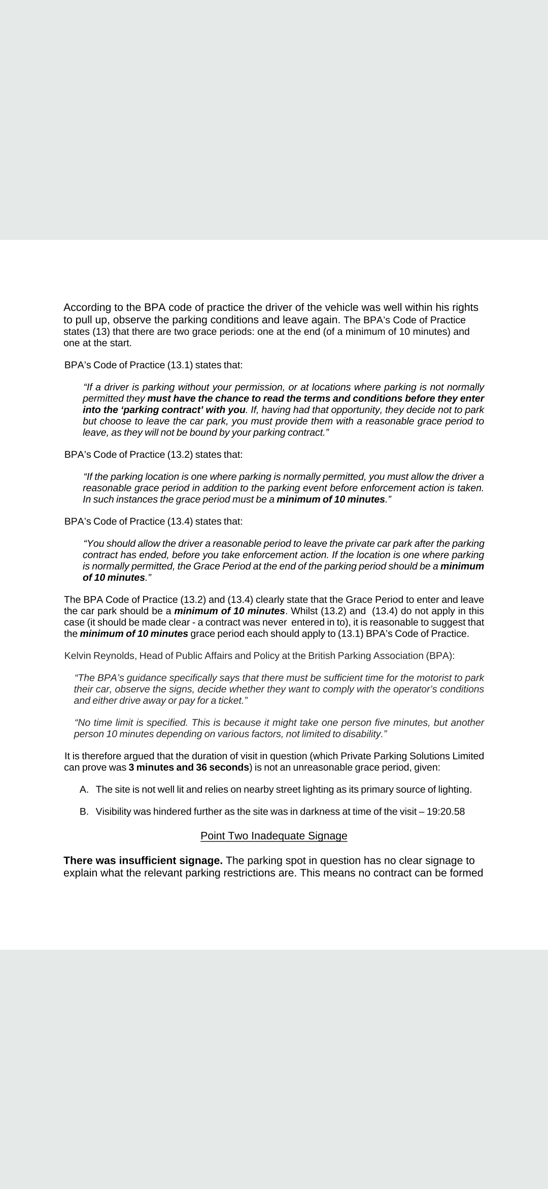 According to the BPA code of practice the driver of the vehicle was well within his rights to pull up, observe the parking conditions and leave again. The BPA’s Code of Practice states (13) that there are two grace periods: one at the end (of a minimum of 10 minutes) and one at the start.BPA’s Code of Practice (13.1) states that:“If a driver is parking without your permission, or at locations where parking is not normally permitted they must have the chance to read the terms and conditions before they enter into the ‘parking contract’ with you. If, having had that opportunity, they decide not to park but choose to leave the car park, you must provide them with a reasonable grace period to leave, as they will not be bound by your parking contract.”BPA’s Code of Practice (13.2) states that:“If the parking location is one where parking is normally permitted, you must allow the driver a reasonable grace period in addition to the parking event before enforcement action is taken. In such instances the grace period must be a minimum of 10 minutes.”BPA’s Code of Practice (13.4) states that:“You should allow the driver a reasonable period to leave the private car park after the parking contract has ended, before you take enforcement action. If the location is one where parking is normally permitted, the Grace Period at the end of the parking period should be a minimum of 10 minutes.”The BPA Code of Practice (13.2) and (13.4) clearly state that the Grace Period to enter and leave the car park should be a minimum of 10 minutes. Whilst (13.2) and (13.4) do not apply in this case (it should be made clear - a contract was never entered in to), it is reasonable to suggest that the minimum of 10 minutes grace period each should apply to (13.1) BPA’s Code of Practice.Kelvin Reynolds, Head of Public Affairs and Policy at the British Parking Association (BPA):“The BPA’s guidance specifically says that there must be sufficient time for the motorist to park their car, observe the signs, decide whether they want to comply with the operator’s conditions and either drive away or pay for a ticket.”“No time limit is specified. This is because it might take one person five minutes, but another person 10 minutes depending on various factors, not limited to disability.”It is therefore argued that the duration of visit in question (which Private Parking Solutions Limited can prove was 3 minutes and 36 seconds) is not an unreasonable grace period, given:A. The site is not well lit and relies on nearby street lighting as its primary source of lighting. B. Visibility was hindered further as the site was in darkness at time of the visit – 19:20.58 Point Two Inadequate SignageThere was insufficient signage. The parking spot in question has no clear signage to explain what the relevant parking restrictions are. This means no contract can be formed.