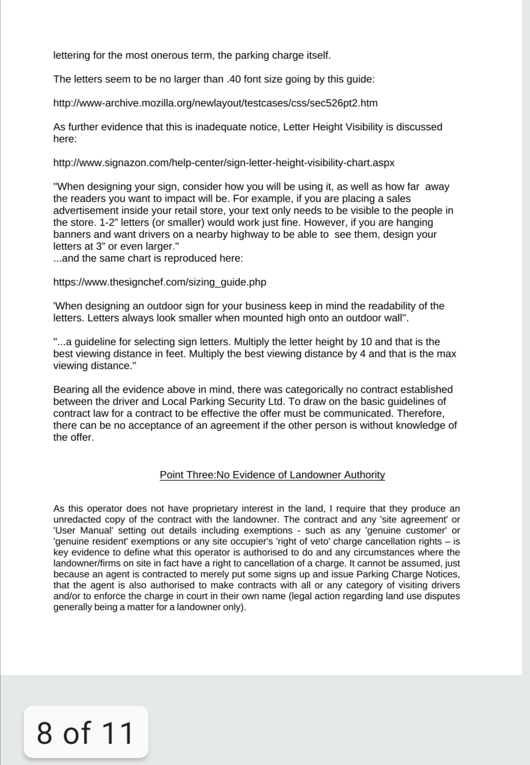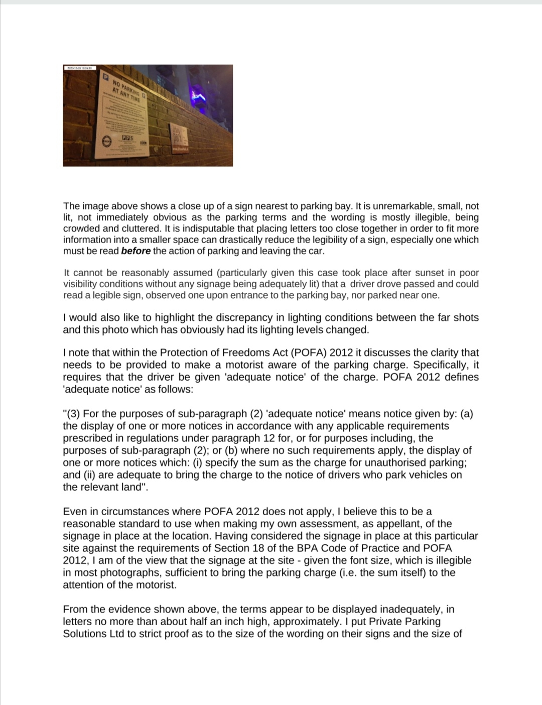 states:“Signs should be readable and understandable at all times, including during the hours of darkness or at dusk if and when parking enforcement activity takes place at those times. This can be achieved in a variety of ways such as by direct lighting or by using the lighting for the parking area. If the sign itself is not directly or indirectly lit, we suggest that it should be made of a retro-reflective material”Furthermore that there is no ground marking indicating that the parking spot is private, or if there is, it is not clear and obvious in low light or in wet conditions.Evidence two: inability to see ground markings indicating private parking. We can also see in this image how dark the wall is where the sign is positioned.Evidence Three: Weather conditions on the night reducing legibility of sign (covered in raindrops) and small letters. The image above shows a close up of a sign nearest to parking bay. It is unremarkable, small, not lit, not immediately obvious as the parking terms and the wording is mostly illegible, being crowded and cluttered. It is indisputable that placing letters too close together in order to fit more information into a smaller space can drastically reduce the legibility of a sign, especially one which must be read before the action of parking and leaving the car.It cannot be reasonably assumed (particularly given this case took place after sunset in poor visibility conditions without any signage being adequately lit) that a driver drove passed and could read a legible sign, observed one upon entrance to the parking bay, nor parked near one.I would also like to highlight the discrepancy in lighting conditions between the far shots and this photo which has obviously had its lighting levels changed.I note that within the Protection of Freedoms Act (POFA) 2012 it discusses the clarity that needs to be provided to make a motorist aware of the parking charge. Specifically, it requires that the driver be given 'adequate notice' of the charge. POFA 2012 defines 'adequate notice' as follows:''(3) For the purposes of sub-paragraph (2) 'adequate notice' means notice given by: (a) the display of one or more notices in accordance with any applicable requirements prescribed in regulations under paragraph 12 for, or for purposes including, the purposes of sub-paragraph (2); or (b) where no such requirements apply, the display of one or more notices which: (i) specify the sum as the charge for unauthorised parking; and (ii) are adequate to bring the charge to the notice of drivers who park vehicles on the relevant land''.Even in circumstances where POFA 2012 does not apply, I believe this to be a reasonable standard to use when making my own assessment, as appellant, of the signage in place at the location. Having considered the signage in place at this particular site against the requirements of Section 18 of the BPA Code of Practice and POFA 2012, I am of the view that the signage at the site - given the font size, which is illegible in most photographs, sufficient to bring the parking charge (i.e. the sum itself) to the attention of the motorist.From the evidence shown above, the terms appear to be displayed inadequately, in letters no more than about half an inch high, approximately. I put Private Parking Solutions Ltd to strict proof as to the size of the wording on their signs and the size of lettering for the most onerous term, the parking charge itself. The letters seem to be no larger than .40 font size going by this guide: xxxAs further evidence that this is inadequate notice, Letter Height Visibility is discussed here:Xxx''When designing your sign, consider how you will be using it, as well as how far away the readers you want to impact will be. For example, if you are placing a sales advertisement inside your retail store, your text only needs to be visible to the people in the store. 1-2” letters (or smaller) would work just fine. However, if you are hanging banners and want drivers on a nearby highway to be able to see them, design your letters at 3” or even larger.'' ...and the same chart is reproduced here:Xxx'When designing an outdoor sign for your business keep in mind the readability of the letters. Letters always look smaller when mounted high onto an outdoor wall''.''...a guideline for selecting sign letters. Multiply the letter height by 10 and that is the best viewing distance in feet. Multiply the best viewing distance by 4 and that is the max viewing distance.''Bearing all the evidence above in mind, there was categorically no contract established between the driver and Local Parking Security Ltd. To draw on the basic guidelines of contract law for a contract to be effective the offer must be communicated. Therefore, there can be no acceptance of an agreement if the other person is without knowledge of the offer.
