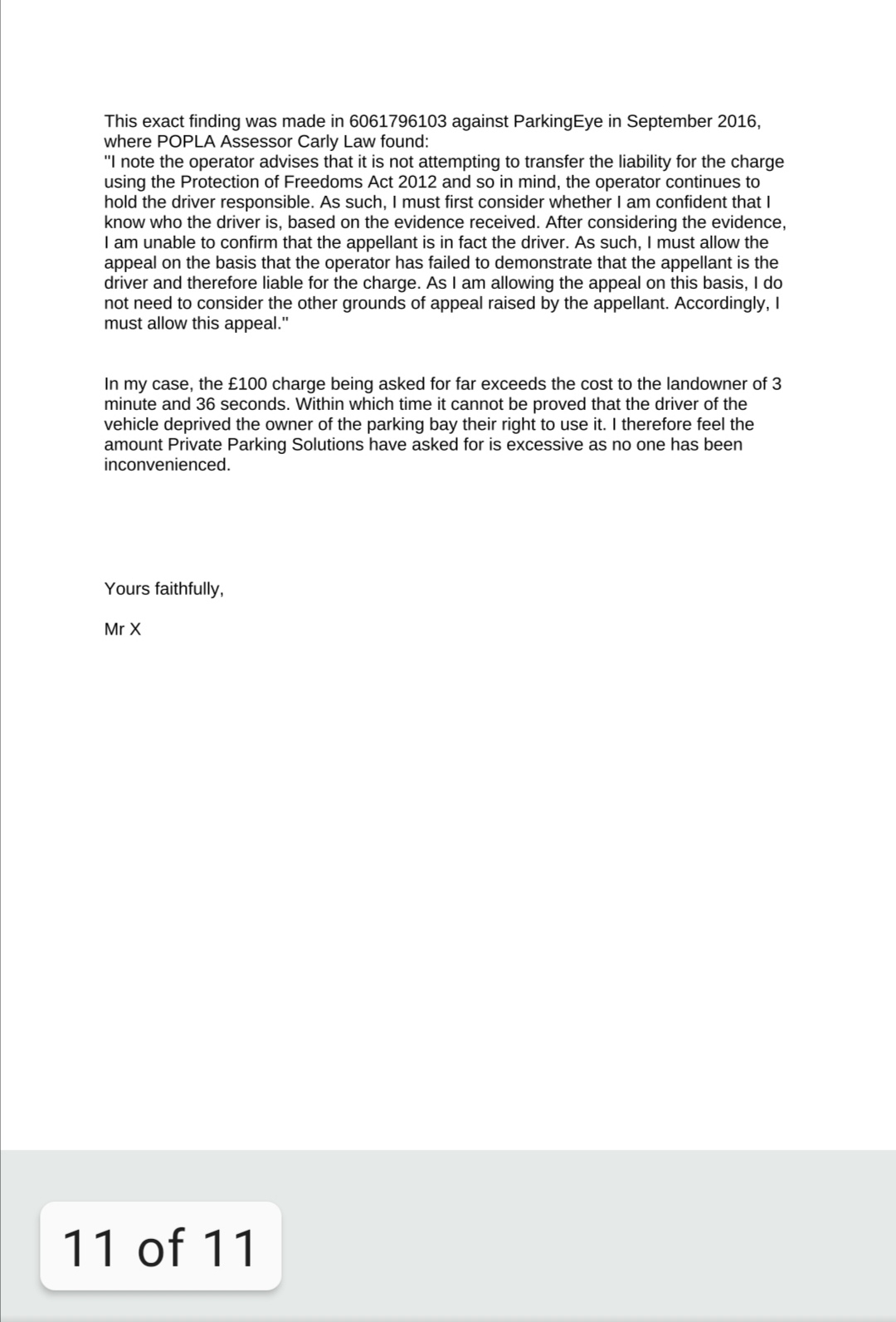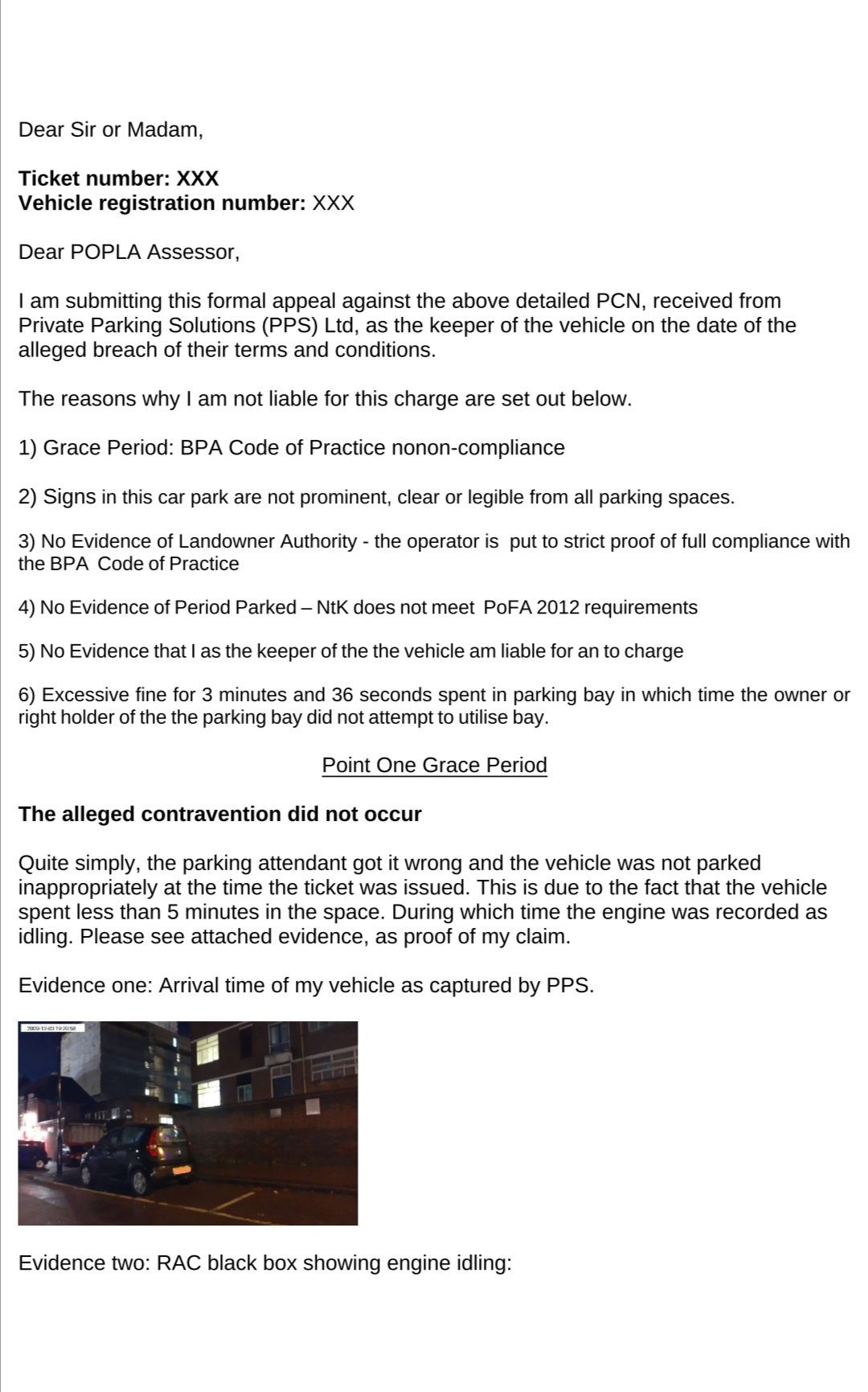 Dear Sir or Madam,Ticket number: XXX Vehicle registration number: XXX Dear POPLA Assessor,I am submitting this formal appeal against the above detailed PCN, received from Private Parking Solutions (PPS) Ltd, as the keeper of the vehicle on the date of the alleged breach of their terms and conditions.The reasons why I am not liable for this charge are set out below. 1) Grace Period: BPA Code of Practice nonon-compliance 2) Signs in this car park are not prominent, clear or legible from all parking spaces.3) No Evidence of Landowner Authority - the operator is put to strict proof of full compliance with the BPA Code of Practice 4) No Evidence of Period Parked – NtK does not meet PoFA 2012 requirements 5) No Evidence that I as the keeper of the the vehicle am liable for an to charge6) Excessive fine for 3 minutes and 36 seconds spent in parking bay in which time the owner or right holder of the the parking bay did not attempt to utilise bay. Point One Grace PeriodThe alleged contravention did not occurQuite simply, the parking attendant got it wrong and the vehicle was not parked inappropriately at the time the ticket was issued. This is due to the fact that the vehicle spent less than 5 minutes in the space. During which time the engine was recorded as idling. Please see attached evidence, as proof of my claim.Evidence one: Arrival time of my vehicle as captured by PPS. Evidence two: RAC black box showing engine idling: