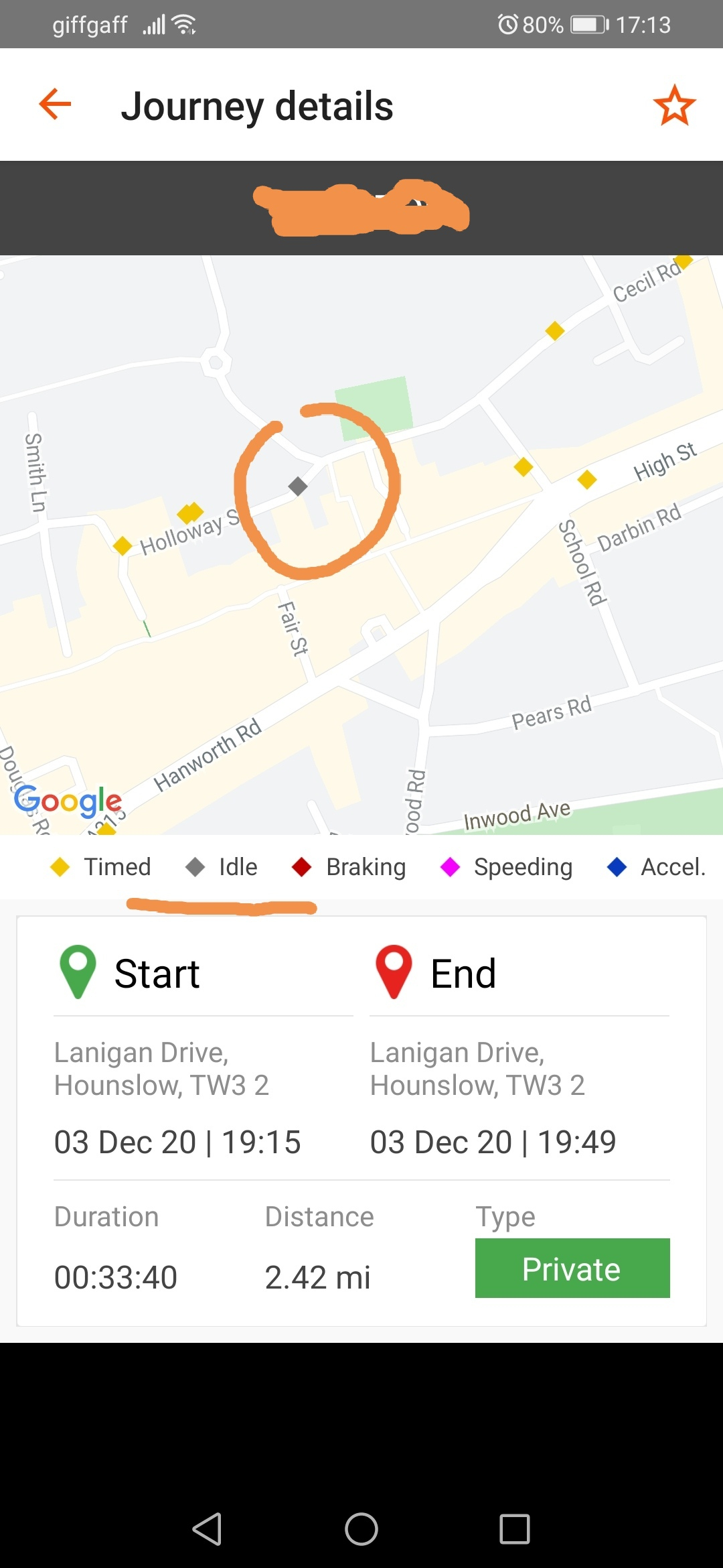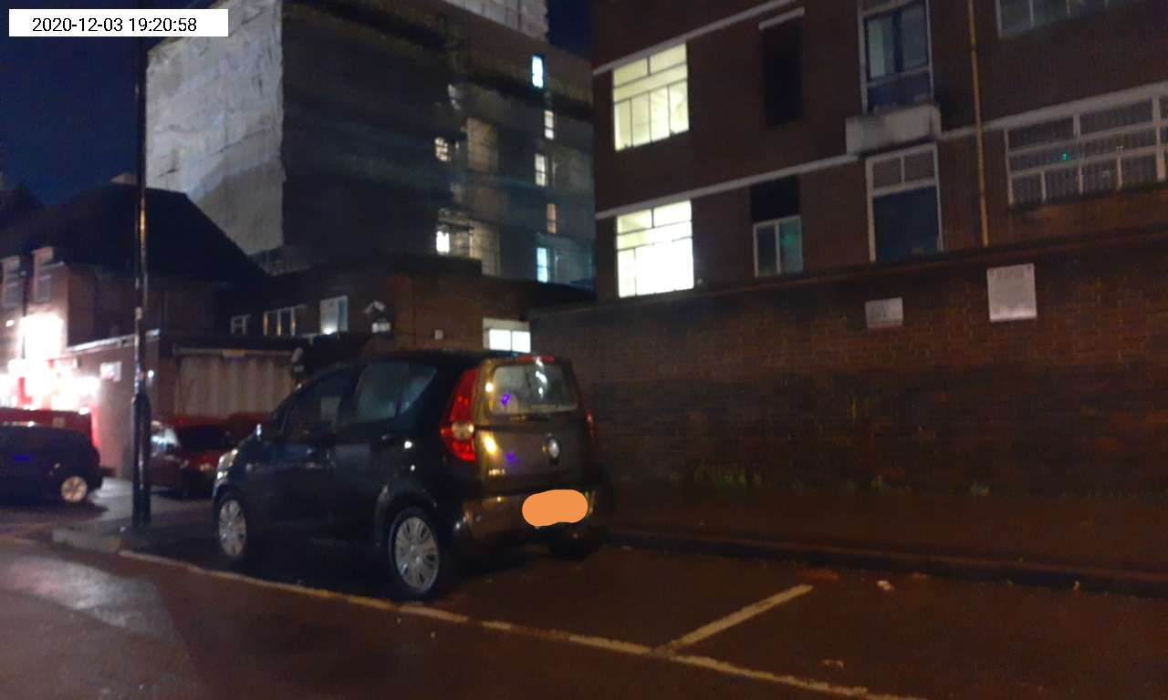 This screen shot shows total journey time as 33 minutes and 40 seconds. That the car idled on Holloway street and then continued up the road turning around and returning to it's point of origin.Evidence four: final photograph of the vehicle by PPS before vehicle departure.PPS can only prove that the time vehicle was at the site was was less than 5 minutes. The RAC black box installed on the vehicle shows the vehicle was idling. Furthermore the telemetric data shows the vehicle leaving the site soon afterwards to continue the journey.