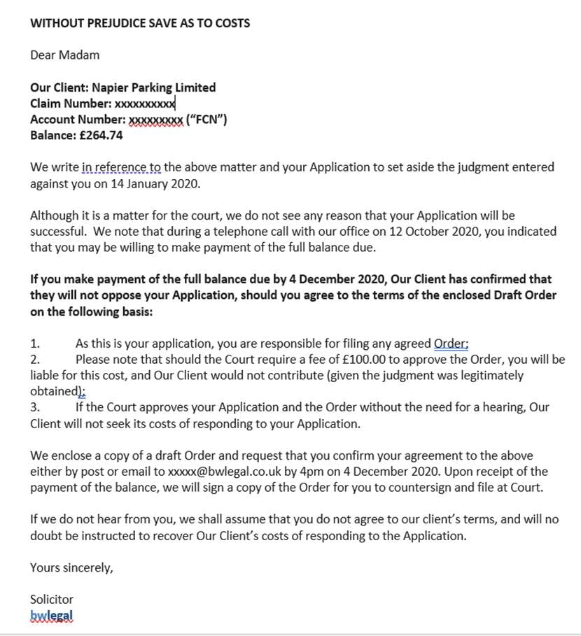 - Also BW Legal sent me an email trying to settle things with consent but with me paying the CCJ £264.74 + £100 to submit the consent order. However, I had already paid £255 for without consent. Well that is a !!!!!! offer and you can ignore it. You have good grounds to achieve a set aside because their client couldn't be arsed to get your correct address before serving a claim defectively! And you will have good prospects of defence because most PPC cases are eminently winnable!