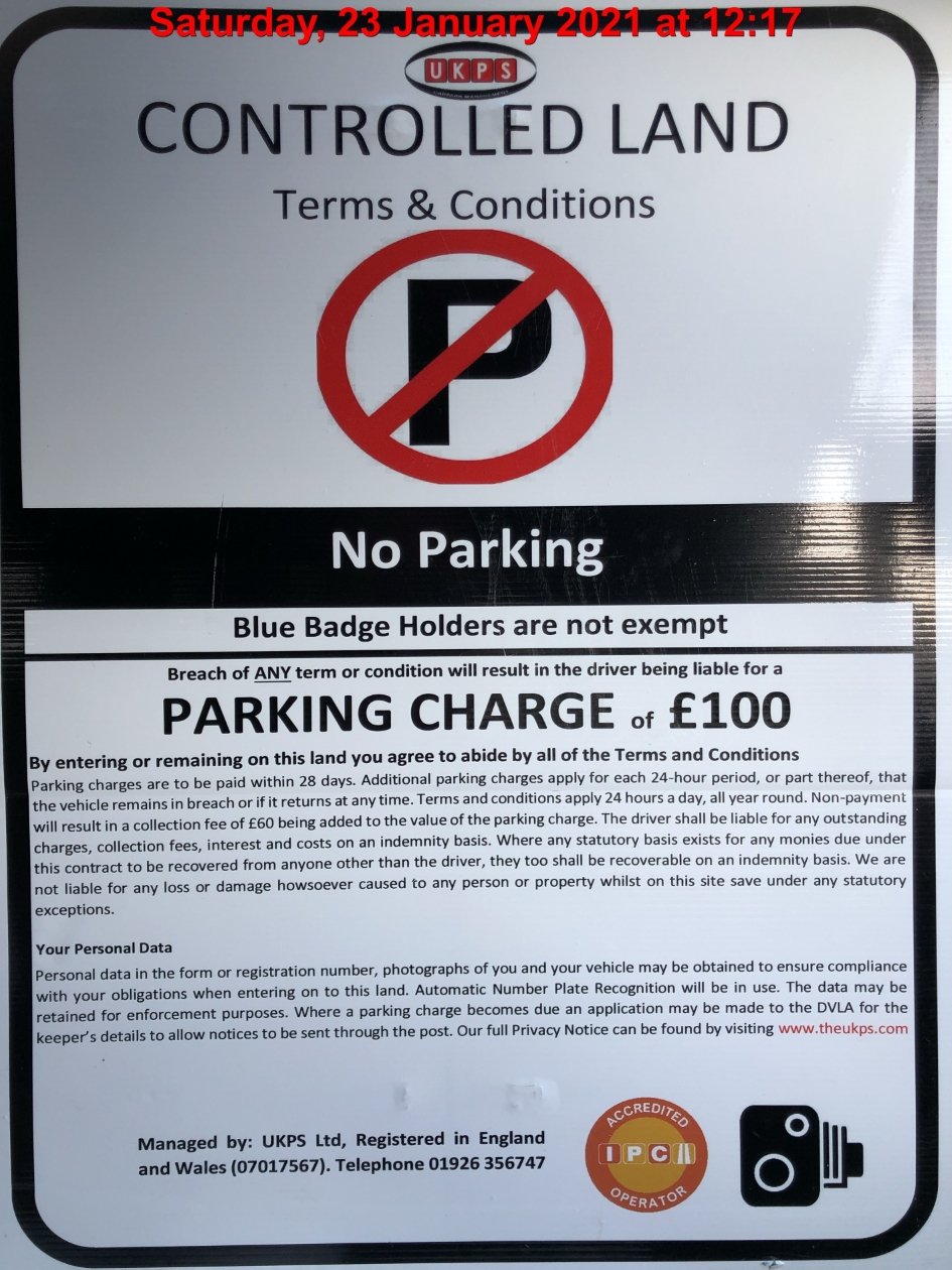 Evening all, my partner received a £60 parking charge notice today in the post addressed to her from UKPS Ltd. I was driving she was waiting in the car engine still running, only there for 5 minutes for click and collect, we were parked in a bay in a local halfords carpark (or what we thought was). However it would appear that halfords have recently disposed of some of their car park to the food store next door, it never used to be like that as ive been going there 15+ years so didn't think any differently, but have since noticed there were signs placed around.