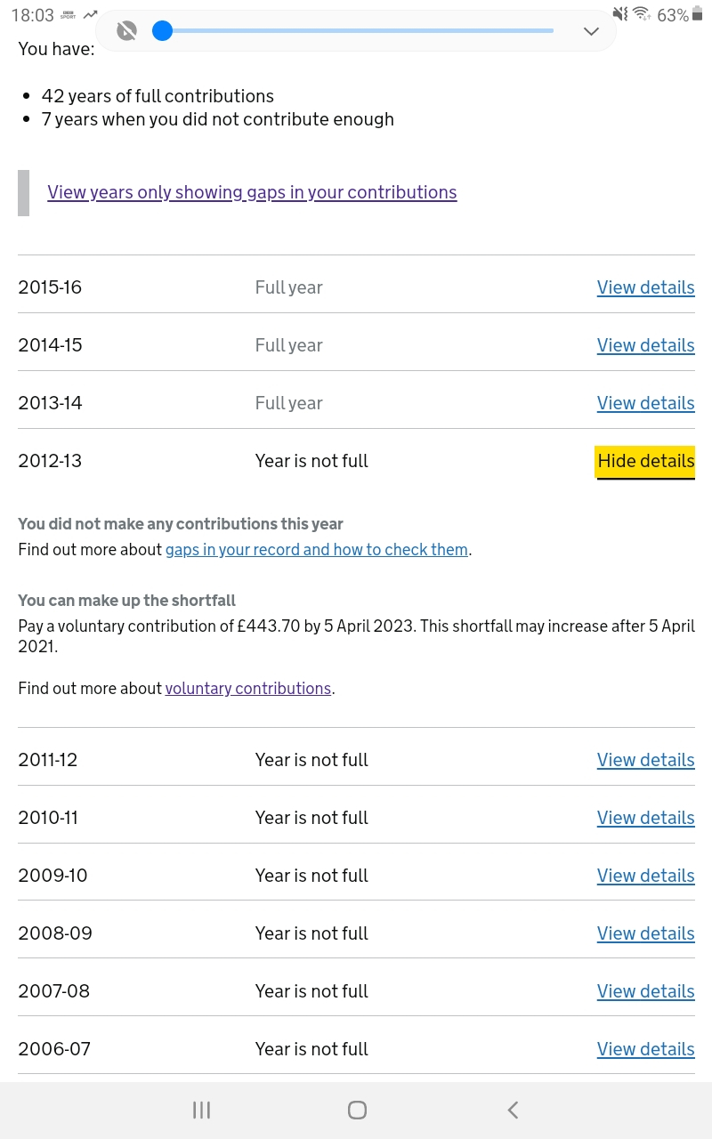 I do realise I'm being thick. But my question remains, even though I accept the reduction due to being contracted out, why wasn't the spare capacity up to 42 years used to compensate?Because that's just how it works.Prior to 2016, under the 'old' rules you got a full 'basic' pension as soon as you had 30 years NI - any more years didn't result in any further increases (ignoring any additonal pension if you were contracted in, which you say you weren't).Because you were contracted out, when they did the calculations at the introduction of the new State Pension in 2016, the amount you got under the old rules was higher that that under the new rules, so that was your 'starting amount'.Under the new rules, any NI years earned or credited since 2016 will increase your forecast by 1/35th of the new State Pension amount until either the maximum amount is reached or you reach State Retirement Age, whichever is sooner.Your screenshot suggests that you have some pre-2016 years that are not full. it's almost certain that there is not going to be any benefit to you in making those up.If - as that screen shot shows - you have 42 full years and 7 part years all before 2016 then I imagine you musrt be very close to State Pension Age, if not already there. What exactly does your forecast say ?0
