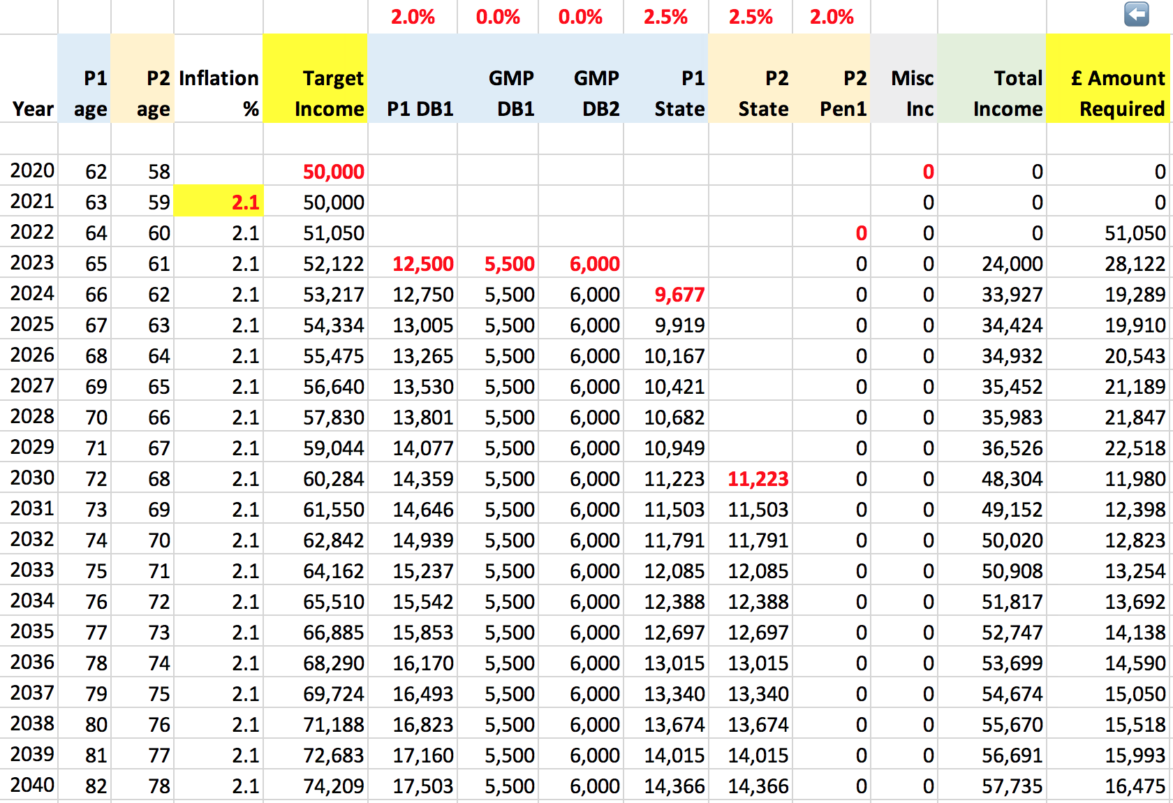 The final column (£ amount required) would be taken from the Stock/DC/cash, and sure, I haven't allowed for tax here, but have put £50k as the target income, rising at 2.1%