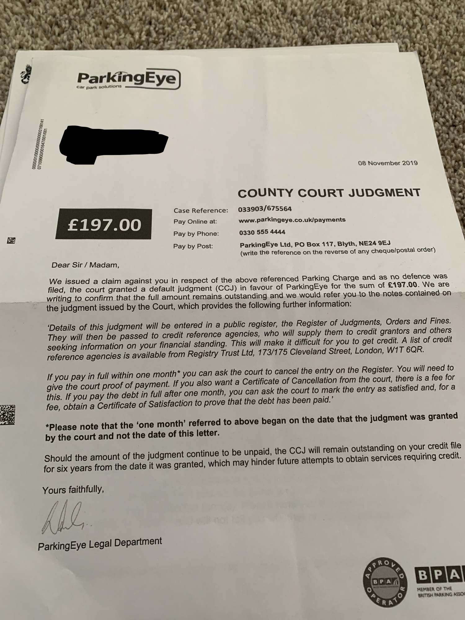 A few months later, despite no communication in the interim, I received a County Court Judgement letter for the unpaid fine- which had increased to £197. I spoke with the hotel management team again- who contact Parkingeye on my behalf. I received a reply from the hotel management team assuring me that the this was an error. They even forwarded correspondence from Parkingeye stating that the fine had been cancelled. I was advised not to worry, and explicitly told to ignore any further correspondence. In face, I did not receive any further correspondence and therefore assumed that the matter had been resolved. Of note, I did not refuse to pay the fine at any point, I simply appealed it. Furthermore, I did not receive any documentation or notification that a CCJ had in fact taken place nor the outcome. Had I received this, I would have promptly paid, even though I don’t admit liability, in order to avoid the situation I am in now.