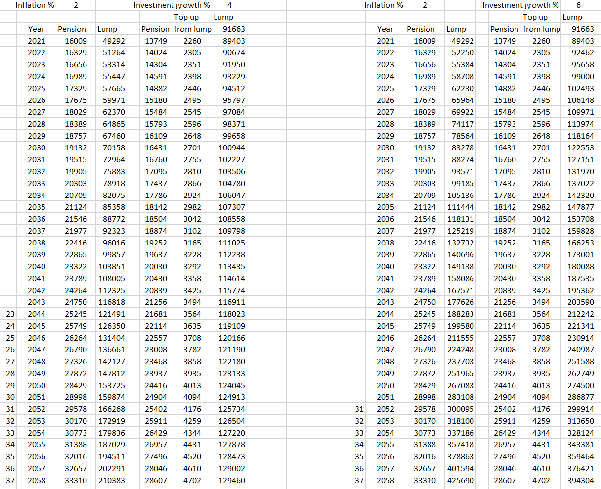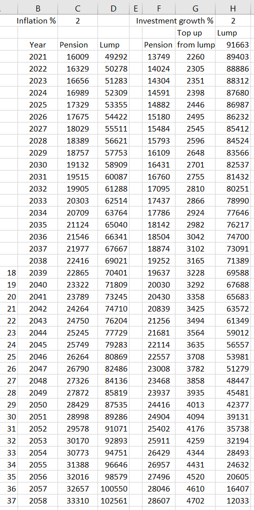 Look at columns C and D. That's your larger pension, smaller lump, growing each year by 2%.Column F is the smaller pension and H is the larger pot. Each year I have taken enough out of the pot to top up the pension to equal the larger pension in column C. In this illustration, the pot (in either case) grows at 2%, just keeping pace with inflation. The bigger pot is ahead for the first 18 years - equal pension, larger pot. After Year 18, the pot is now smaller than it would have been if you took the small lump sum. Obviously the difference gets much bigger if you live to old age.0 -