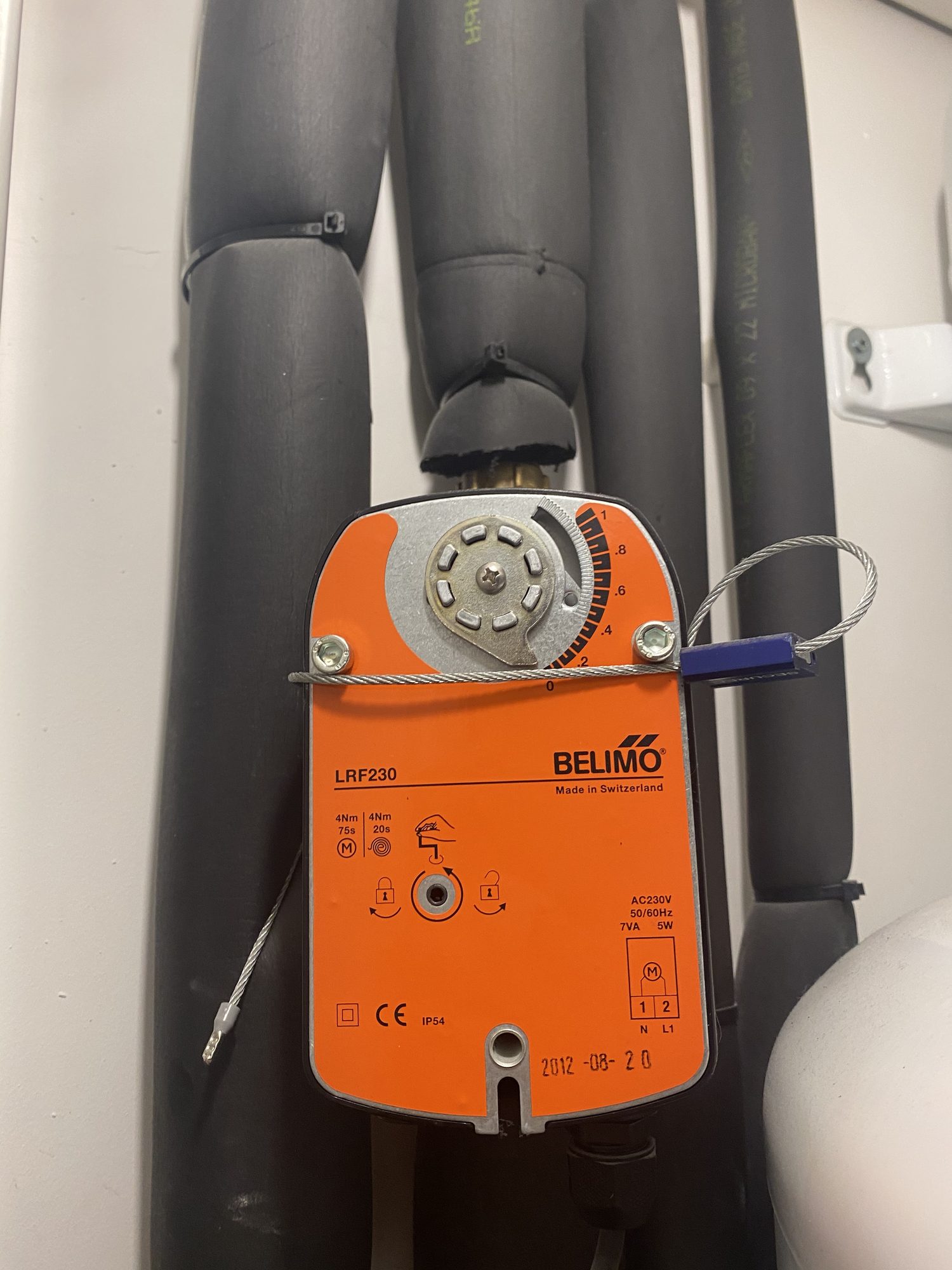 The orange thing up top is one of these https://www.wolseley.co.uk/product/belimo-lrf230-rotary-actuator-230v/ no idea what it’s for bit on turning on or off at the main it’s makes an ungodly whirring house for about 15 seconds as the dial moves from the bottom to the top or vice versatile.