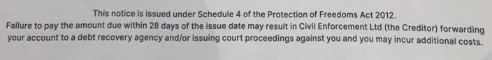 The PCN just states times, dates, photos of entering and exiting and then parking charge due £100, reduced to £60 if paid in 14 days