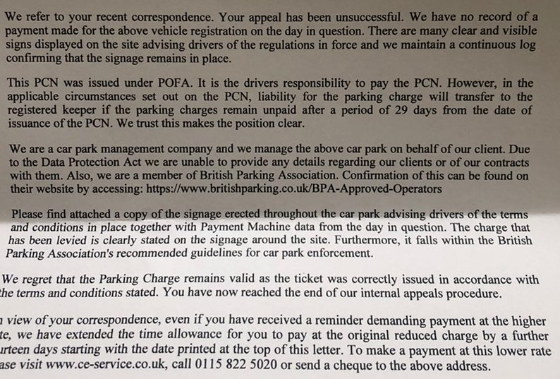 We have photos from ANPR (10 minutes max stay, stayed 20 mins). You cannot see who was driving and we did not state who was driving in our appeal to Civil Enforcement, they then failed to provide this information and state "the PCN was issued under POFA. It is the drivers (sic) responsibility to pay the PCN. However, in the applicable circumstances set out on the PCN liability for the parking charge will transfer to the registered keeper if parking chargers remain unpaid after a period of 29 days from the date of issuance of the PCN"