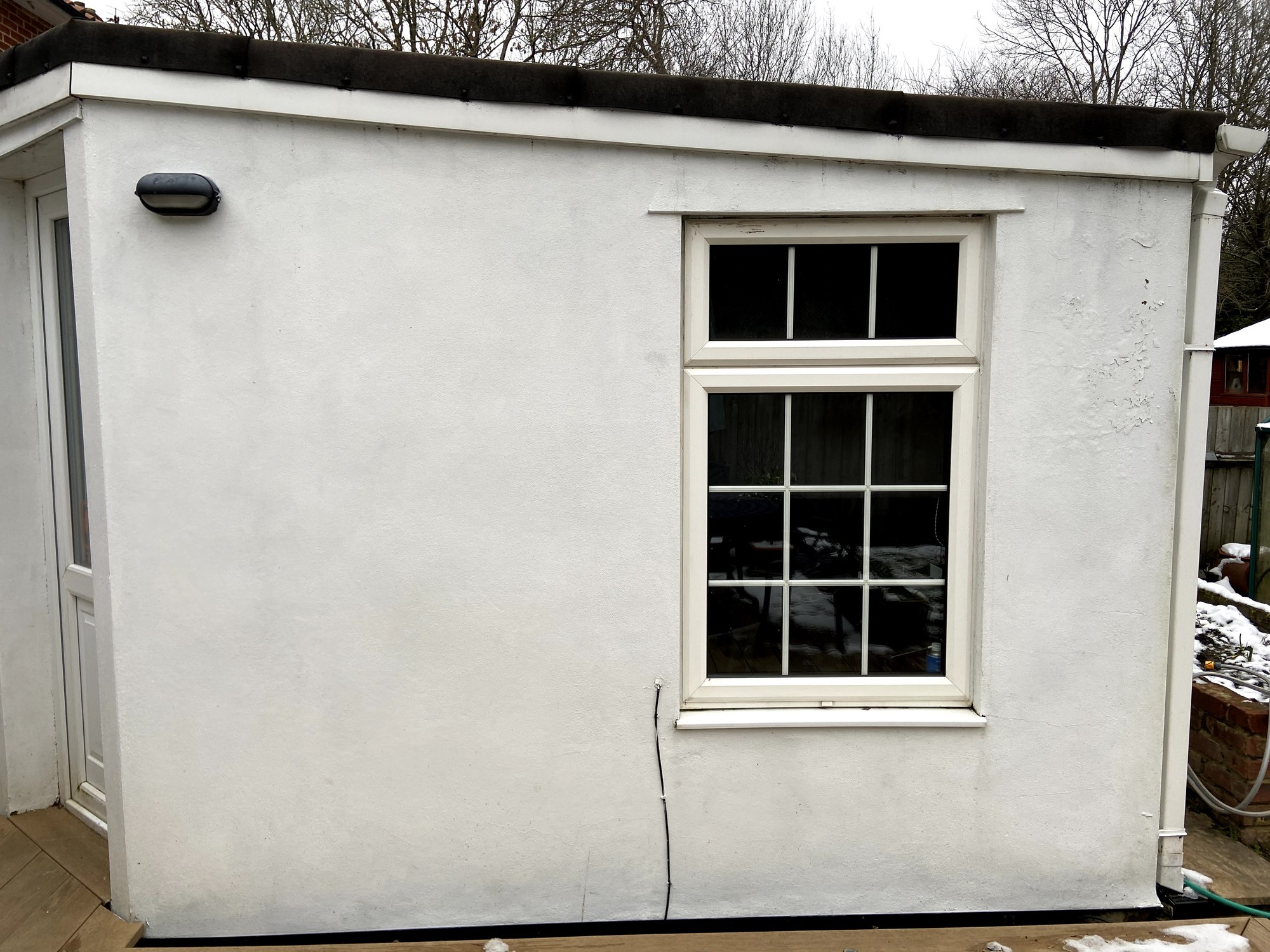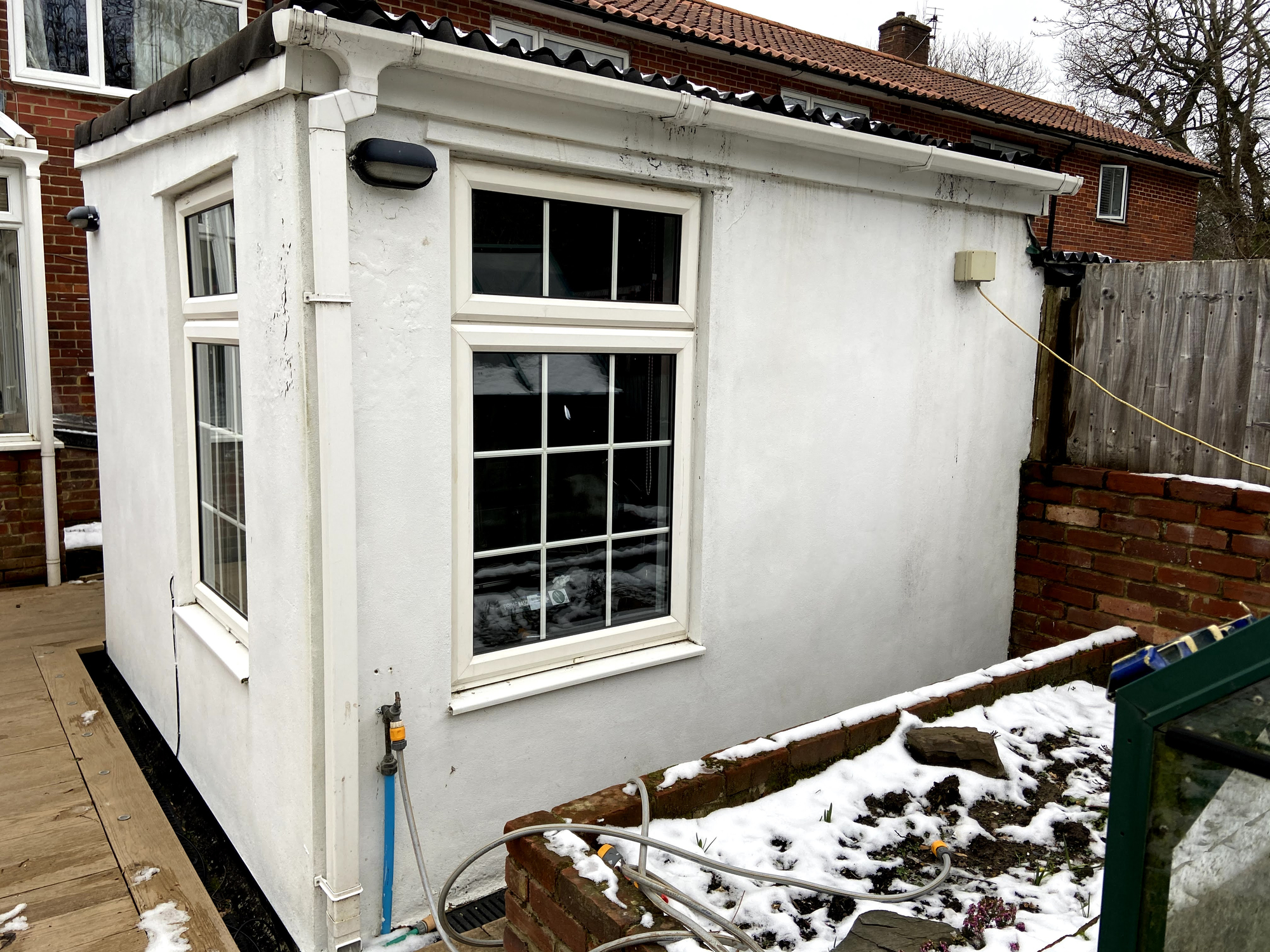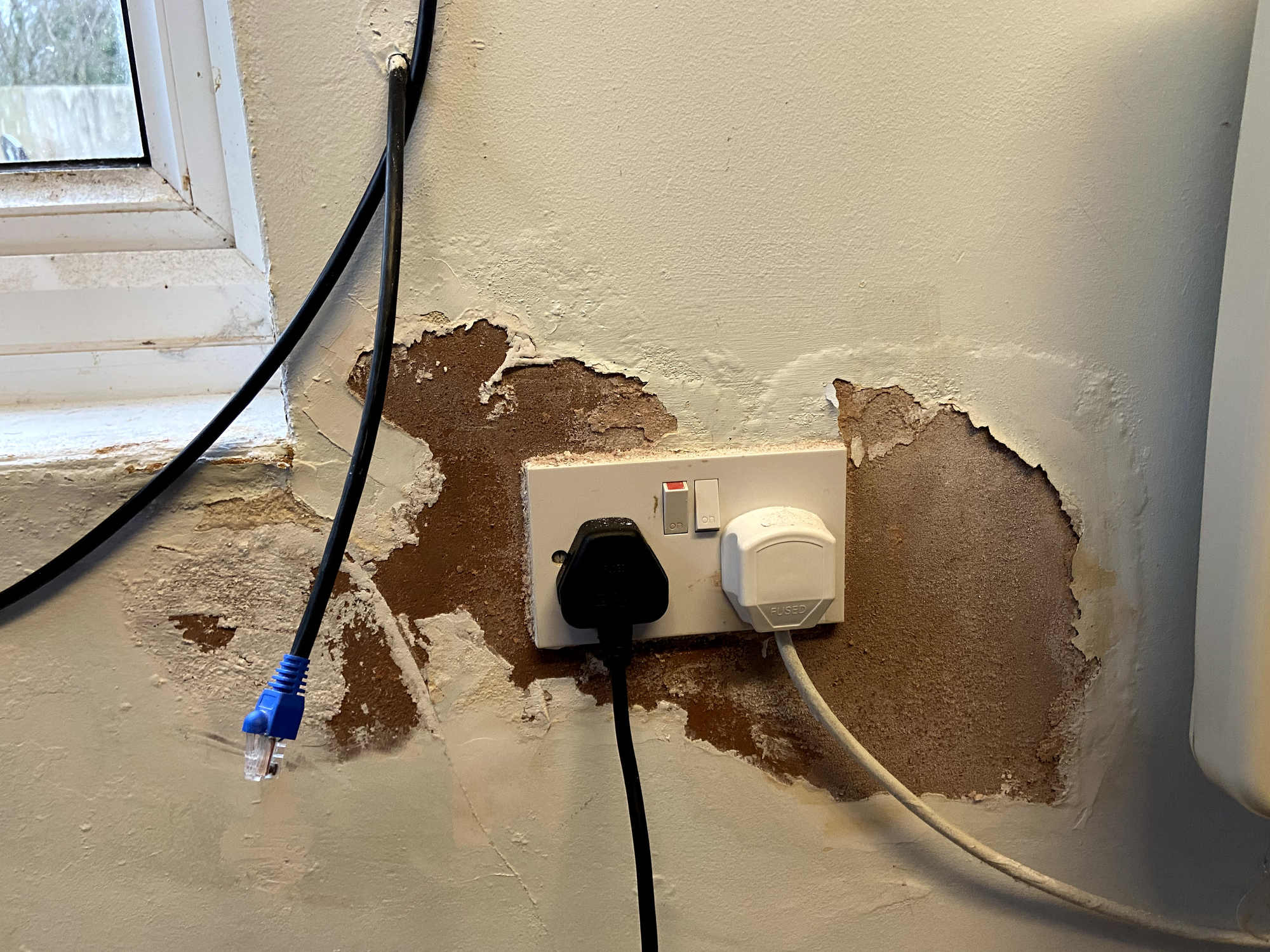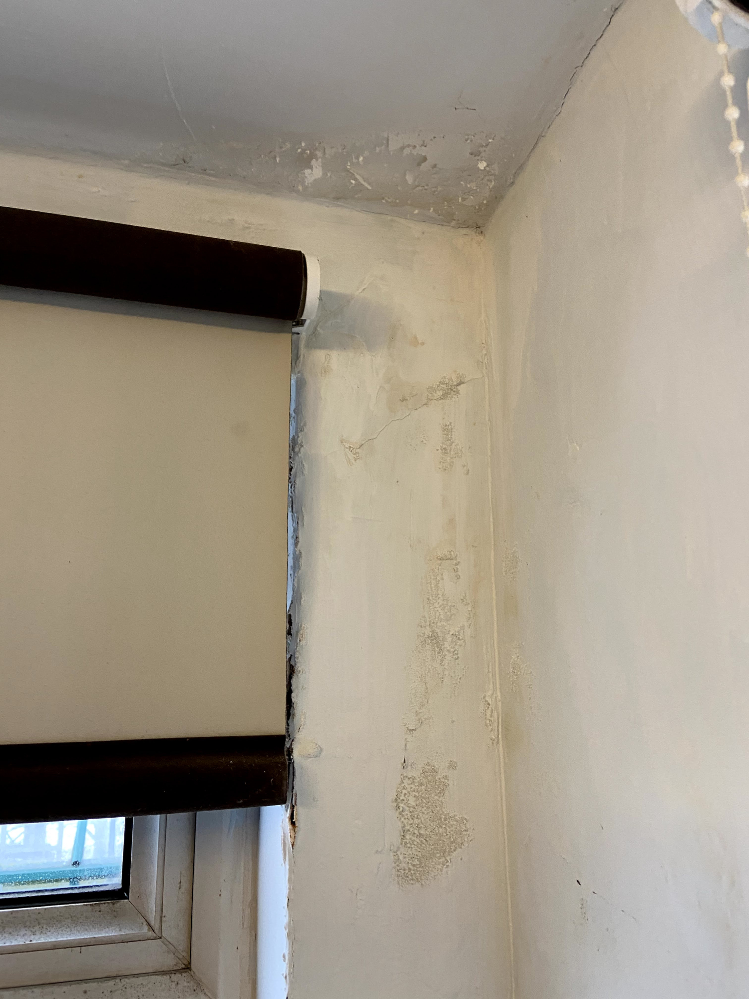 However there is a damp problem that I noticed pretty soon as you can see from the photos. The damp is located around one corner of the building, between the windows and can be seen in multiple places from floor to ceiling. I can also see some bubbling paint on the outside closer to the roof on one of the affected walls. Stangely there are no ventilation holes visiblle inside and it gets stuffy after a while if you have a heater on. I suspect that's not helping the damp problem at all. I can surely open windows more often but the lack of ventilation holes is really strange. There is no trickle vents or any other ways of air the space.