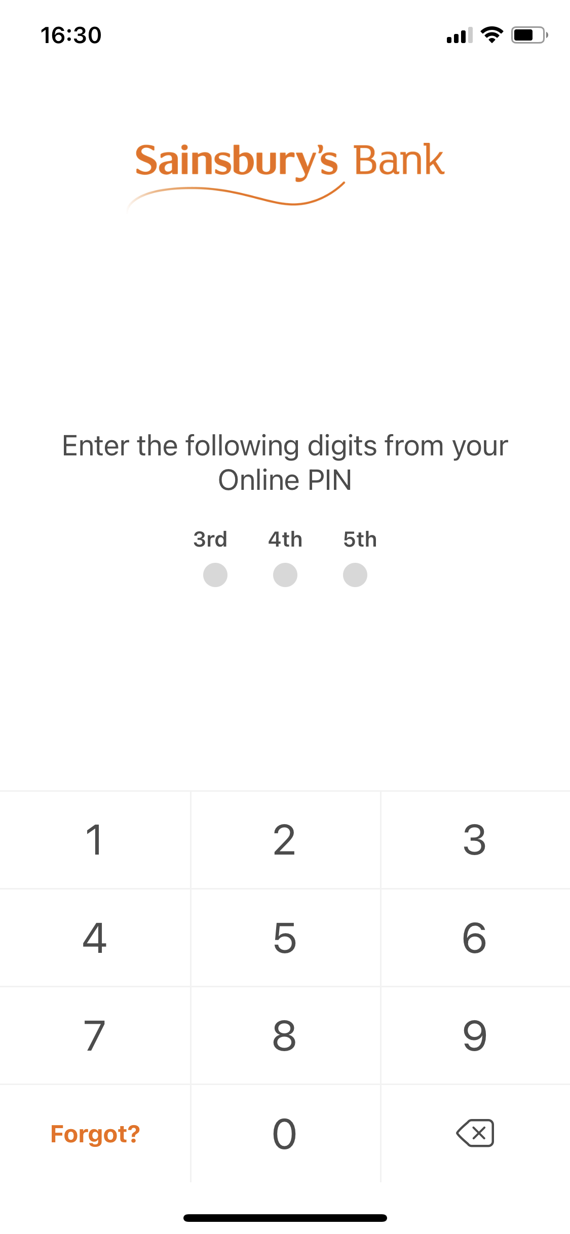 When I try to sign in to my new 0% Sainsbury's credit card account I have to input a random 3 out of 6 number pin within 30 seconds on my Tablet. The choice of the 6 pin numbers is restricted. 123489 is not allowed.