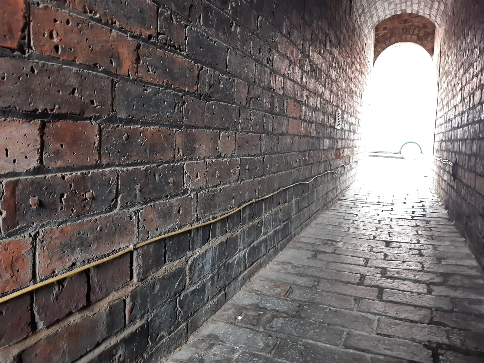 Doozergirl said: The holes are a previously injected DPC, which should tell you all you need to know about how useful these 'damp proofing' treatments really are.Wonder if it has had the waterproof render/plaster slapped on the internal wall as well..The paving in the passageway looks as if it may be original, so I doubt that is the cause of the problem. More likely, a previous owner had a damp "survey" carried out and got conned in to having the "treatments" done. Maybe as a condition for a mortgage... I'd be tempted to go back to bare brick internally and replaster with lime.Any language construct that forces such insanity in this case should be abandoned without regrets. –