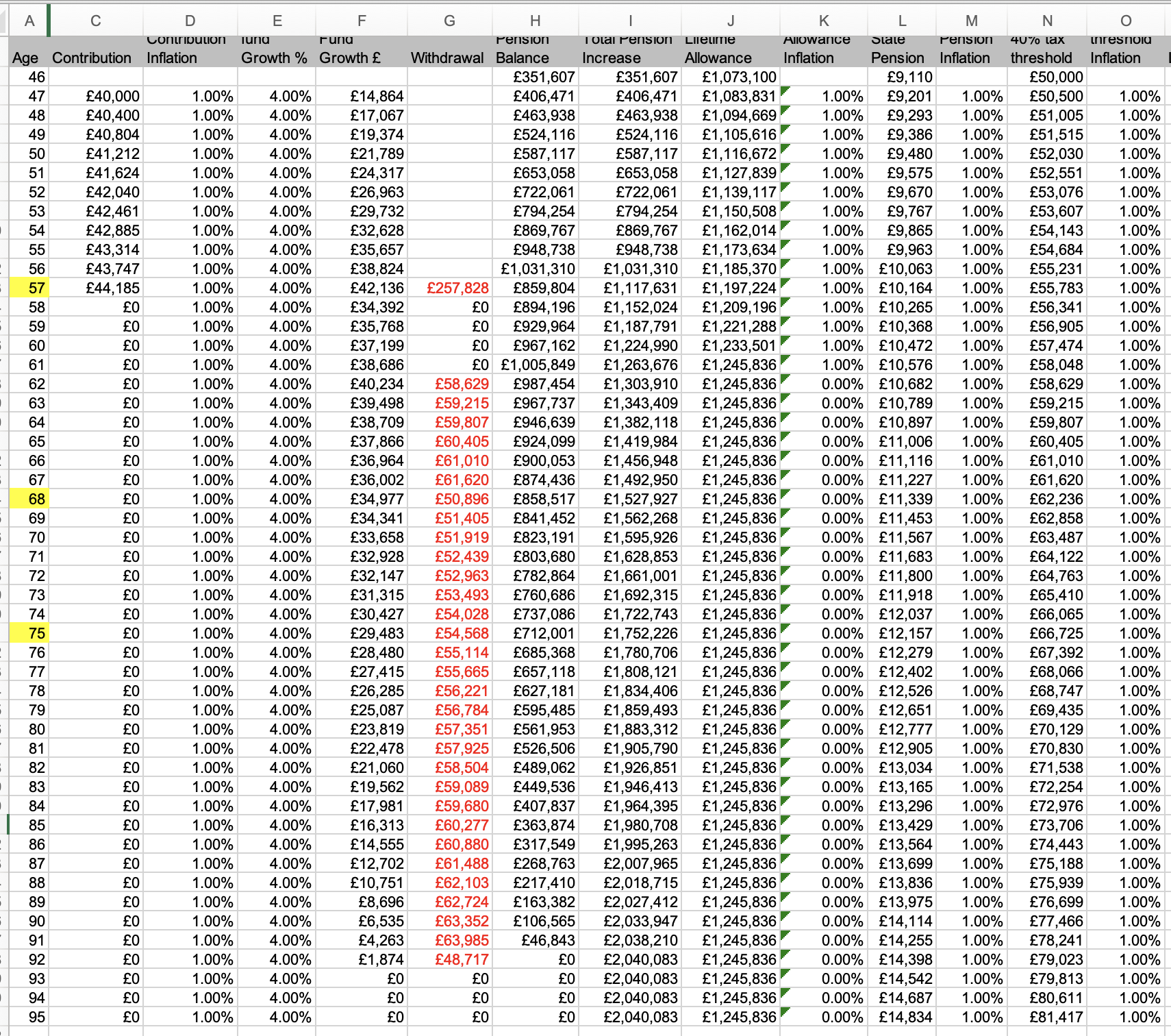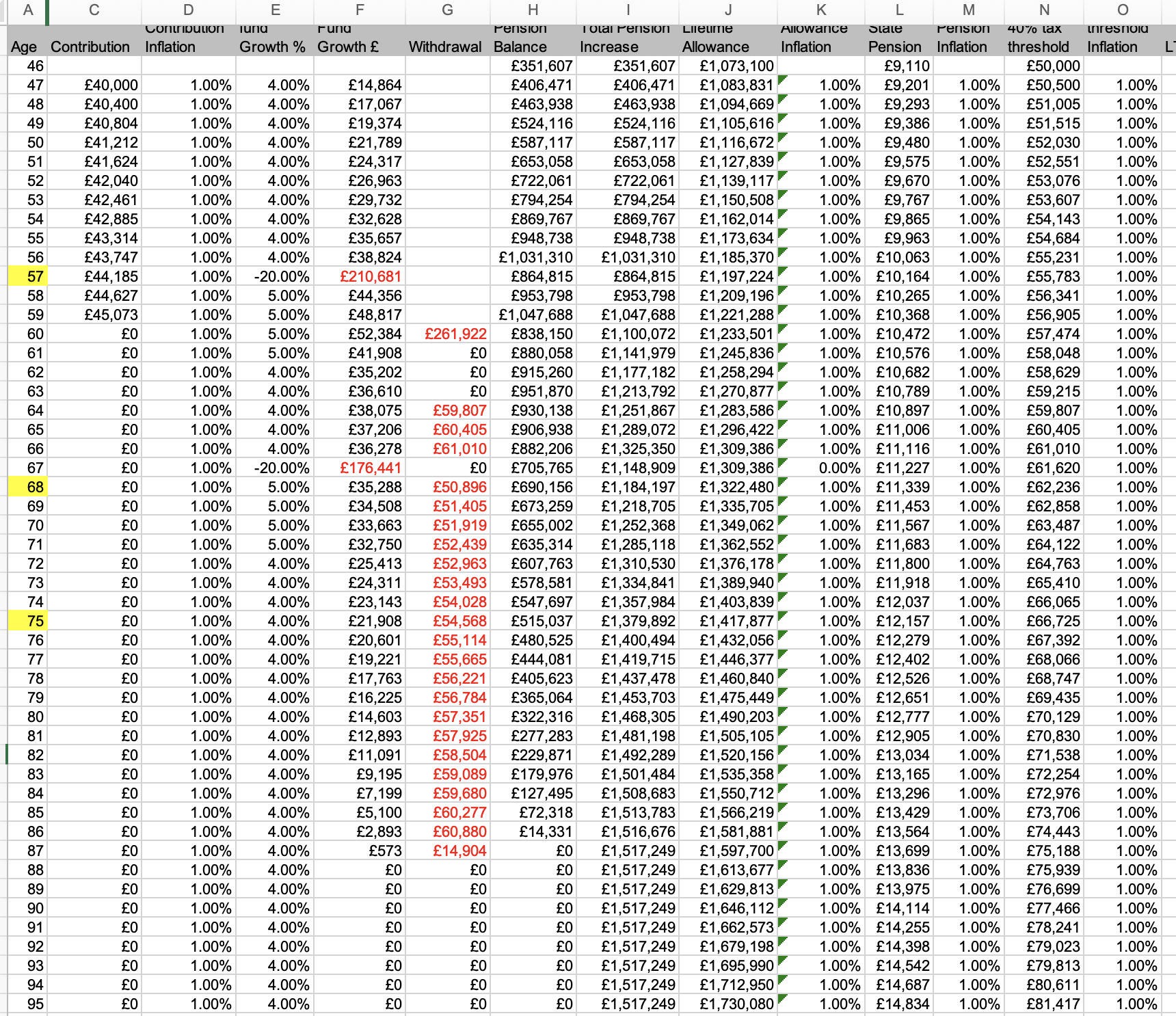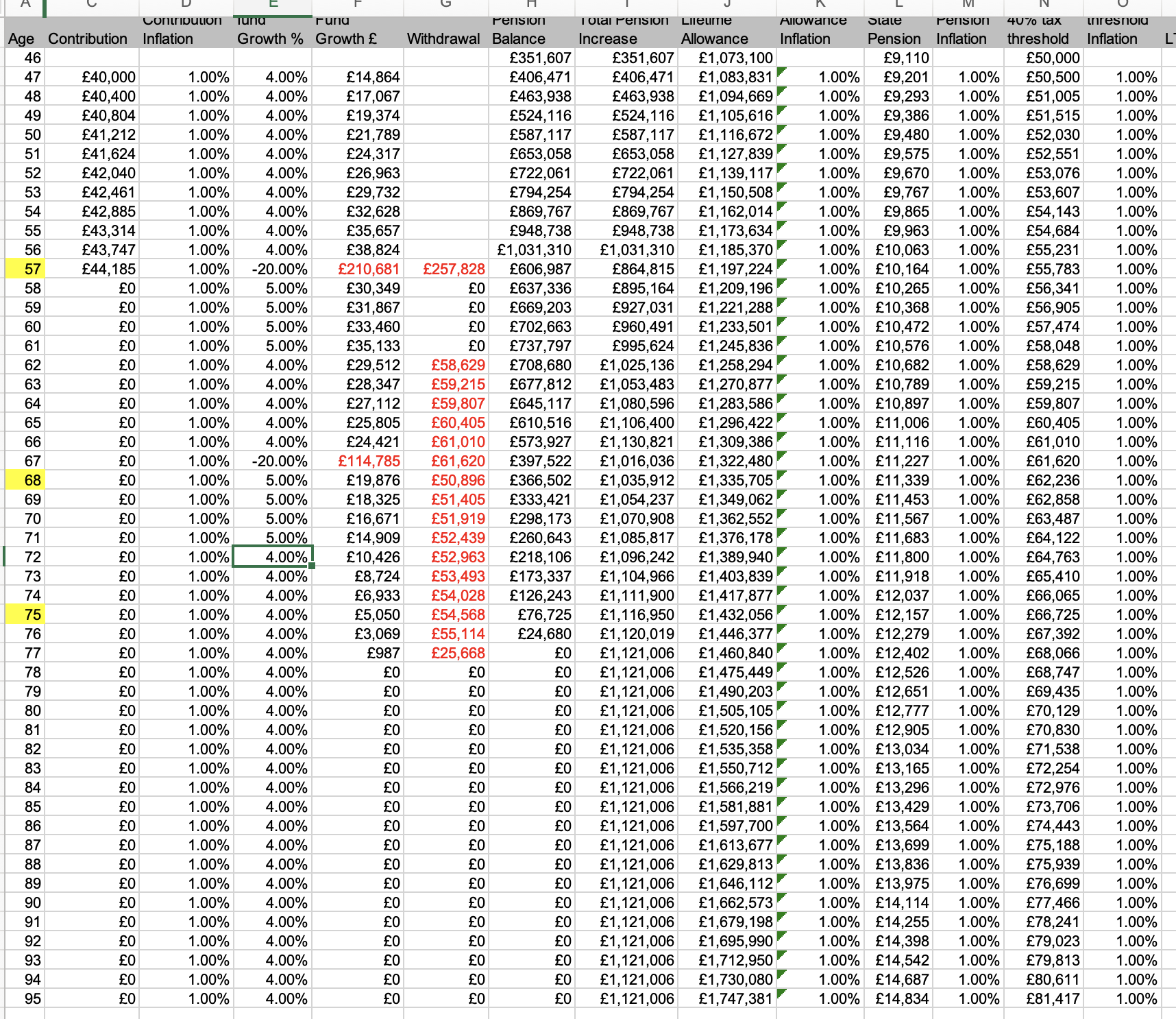 Try sticking a couple of -20% returns (instead of +4%) at, say ages 57 and 67, followed by four +5% yesrs in there to stress test this to see if it still adds upbeeza650 said:Waiting another four years till 62 before drawdown (and living of the 25% tax free lump sum - or not I guess if I do a bit of part time/consultancy work) seem to make a HUUUUGE difference. Doing that I've got income up to 40% band until I'm 91 and there's no way I'm going to live that long.