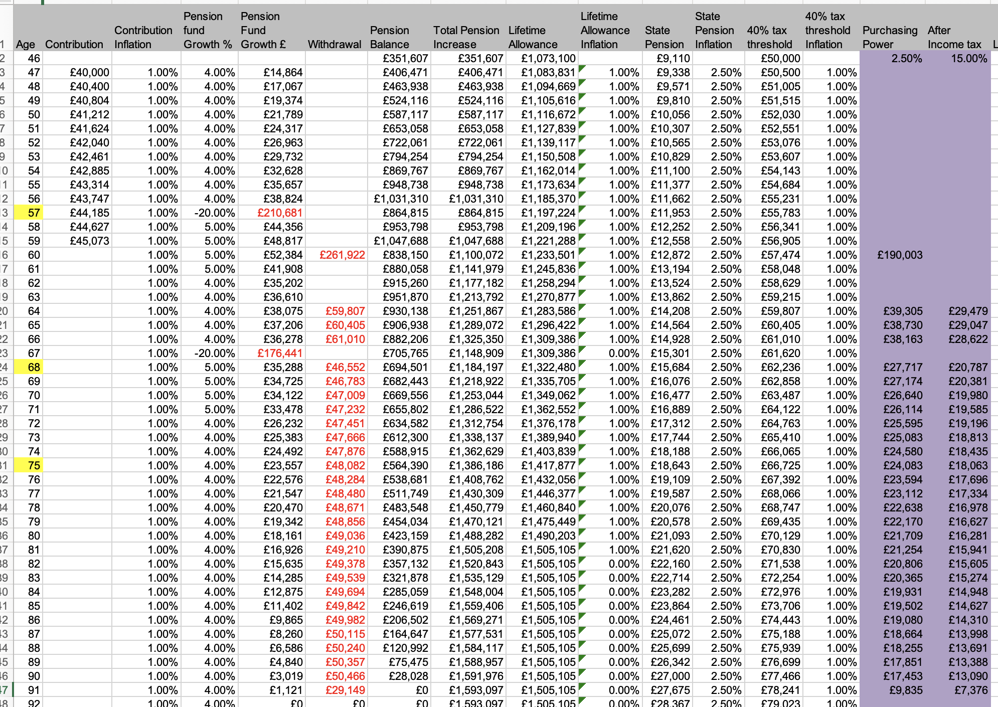 But wait - I've added another two columns in purple on the right - the purchasing power of the pension given 2.5% inflation and taking into account 15% income tax. Ouuuuuuuch that's really sobering - and that's after modifying state pension inflation so it matches purchasing power inflation.
