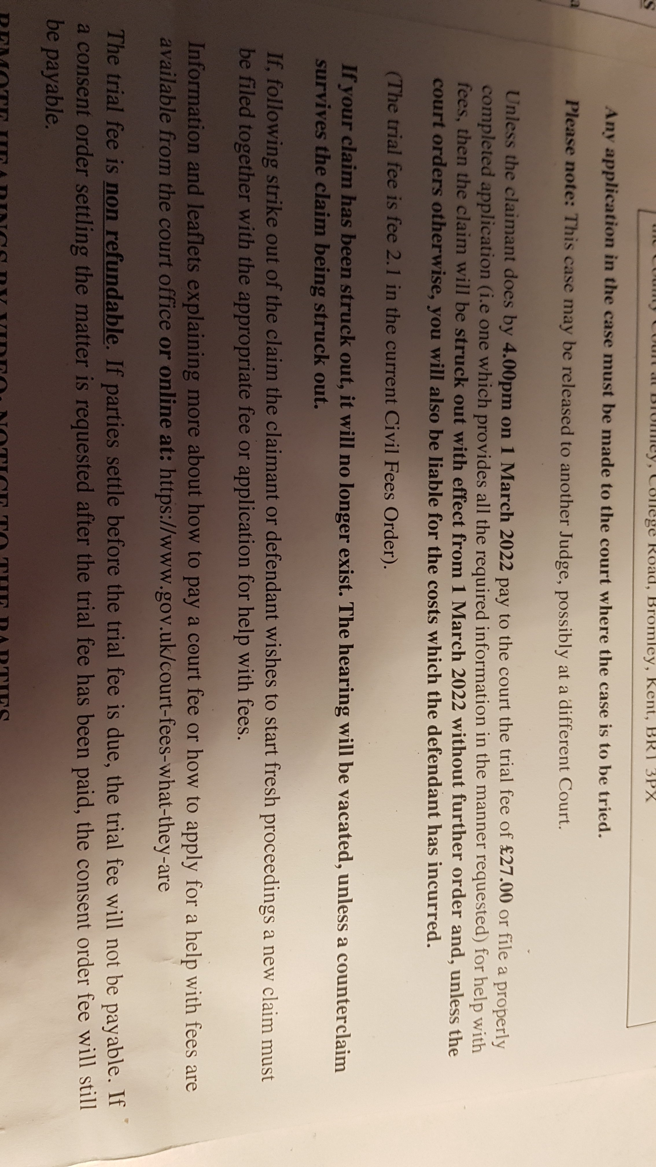 "unless the claimant does by 4.00 pm on 1st March 2022 pay to the court the trial fee of 27 or file properly completed application for help with fees, then the claim will be struck out with effect from 1st March 2022 further order and, unless the court orders otherwise, you will also be liable for the cost which the defendant has incurred"