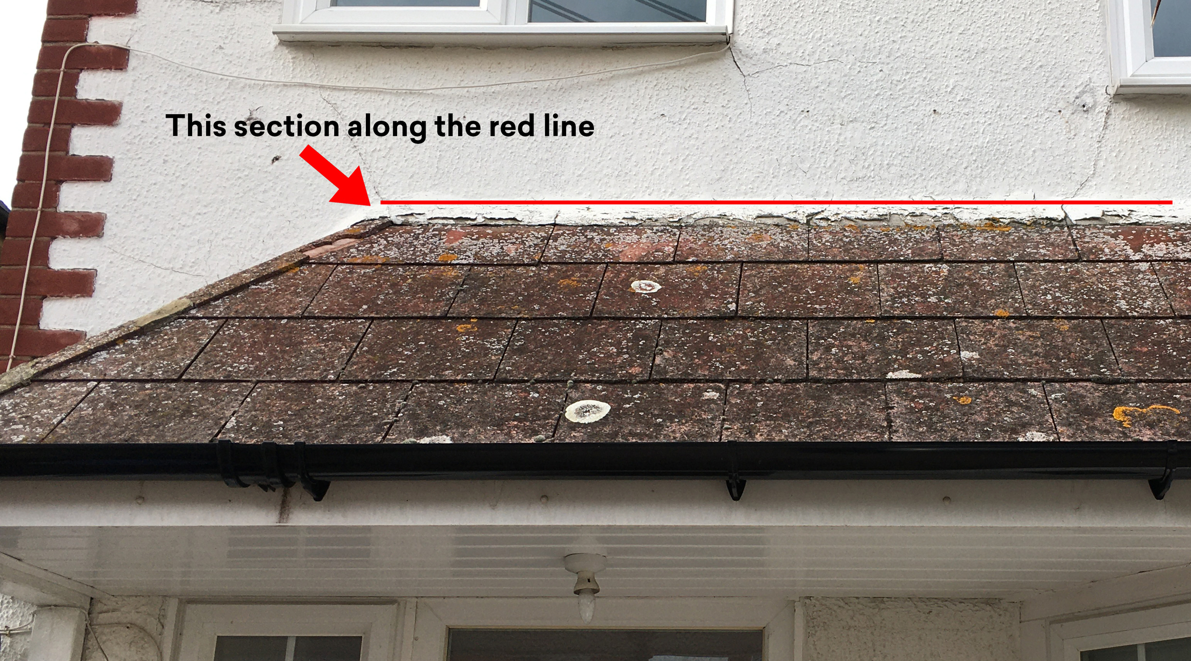 I’d like to smarten up the front of my house, starting with the point at which the sloping patio roof joins the wall (photo attached). The plaster (or whatever it actually is) is cracked and crumbling. I have no idea what to replace it with if I did it myself or if it’s a job for a professional.