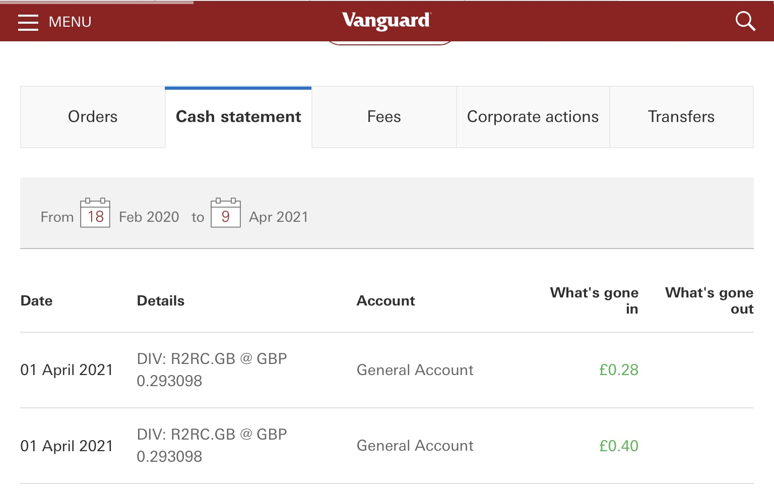 Hi I believe you cannot buy partial funds in ETFs so if your deposit doesn’t cover the price for the whole share price it will go into your cash reserveagent69 said:I have a Vanguard query and thought it best to add it on here, rather than start yet another Vanguard thread.I am mostly invested in the LS funds, but also invested a small amount in 3 of their other funds. Recently I noticed that the amount of cash in my acount has increased. Is there any way of tracking where it came from?# 365 Day Penny Challenge 2021 £111.84/£667.95, # Virtual Sealed Pot 14 £7.56/£200, # Saving for Xmas 2021 £1 a day: £82/£365, # 1 debt vs 100 days £1,240/£1,240, 1 debt vs 100 days £1,000/£1,000,1 debt vs 100 days £0/£3,540,#80 Pay all debt by Xmas 2021: £2,555/£11,295.001 -
