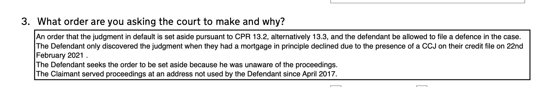 2. I understand that the Claimant obtained a Default Judgment against me as the Defendant on 19/06/2019. I am aware that the Claimant is Civil Enforcement Limited, and that the assumed claim is in respect of an unpaid Parking Charge Notice from 14/08/2018 at the car park for xxxxxxxxxx. Service was defective because this Claim was served at a previous address xxxxxxxxx where I have not lived since April 2017 and not at my then current address xxxxxxxxxx as a result the claimant wasn't entitled to default judgment and the court must set aside as per CPR 13.2. In the alternative, it should set aside pursuant to CPR 13.3.