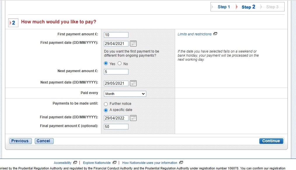 I'm sorry but Nationwide do have the option to do what you want.blue.peter said:Over62 said:I just make the standing order open ended and cancel it manually when it's no longer needed.I see the merit of this, but I prefer to leave as much to run automatically as possible. There's always the risk that I could be unable to put the manual stop on it - e.g., because I'm in the ICU with Covid-19, or in a coma after an RTA. Yes, I know that those are pretty unlikely, but I like to eliminate all risks of this type where I can. I shouldn't need to do things like this manually. This is why I have DDs to pay my credit cards in full, too.I guess that the real issue here is the fact that I've used a system for 45 years (with Midland, Barclays, First Direct, Santander and TSB), and it's worked for me, but Nationwide does things differently.