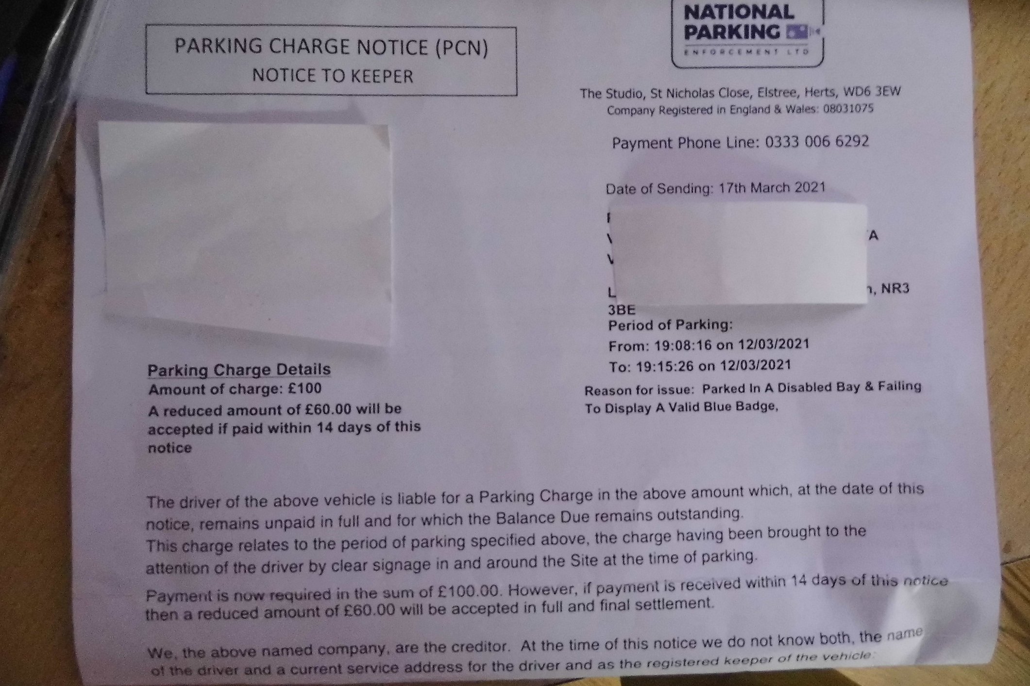 on the 12/03/2021 i parked in a car park marked with disabled signs as my car is a disabled car i put both my disabled cards on dash as i drove in car park but as ive got a niro2 the cards move on my dash to passangers side , was parked for 18 mins and got a parking notice sent to me from national parking enforcement , i told them i was a disabled driver and sent them copys of my cards but thay still say i have to pay costs of 100 pounds , as ive sent them copys of my cards and said i had them on my car when i pulled in do i have to pay them ???