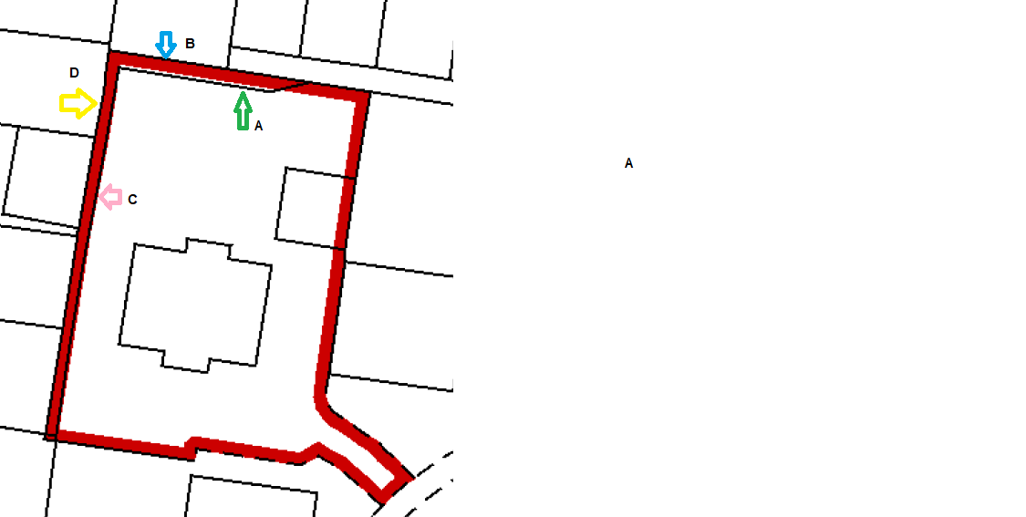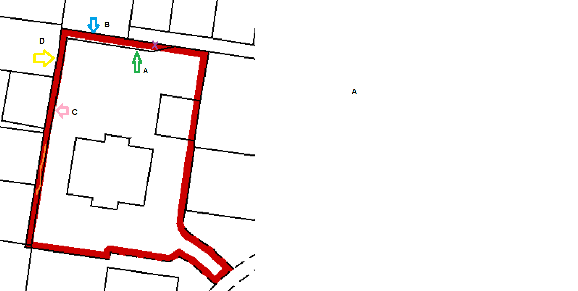 1) Would I be right in saying the arrow marked as A and C is our current fence? ( I say this as this is how the current fence is and "bends" in at arrow A).
