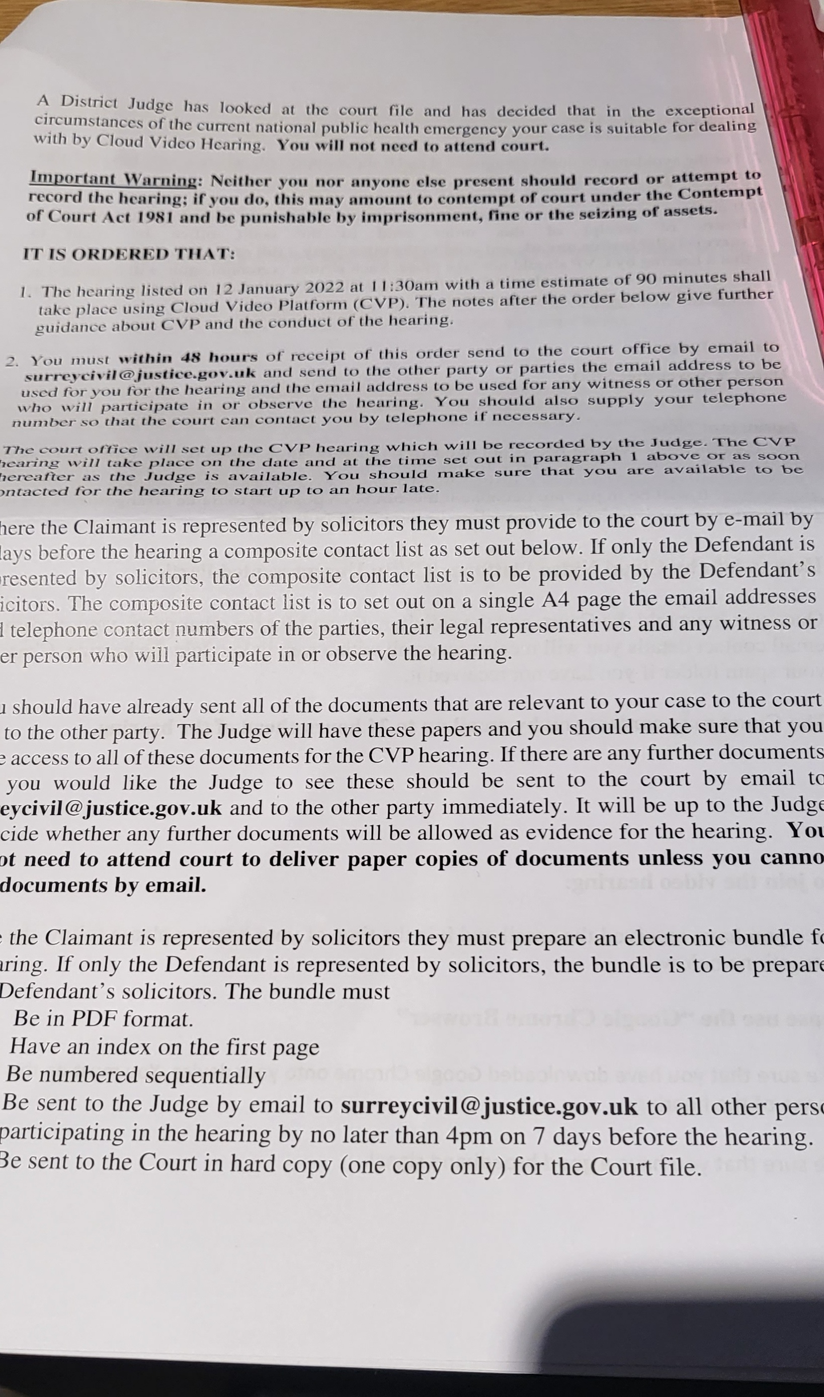 I'm also still confused by the ' you must within 48 hours of receipt of this order send to the court office and other party - the email address to be used for you for the hearing' in the picture above?0 -