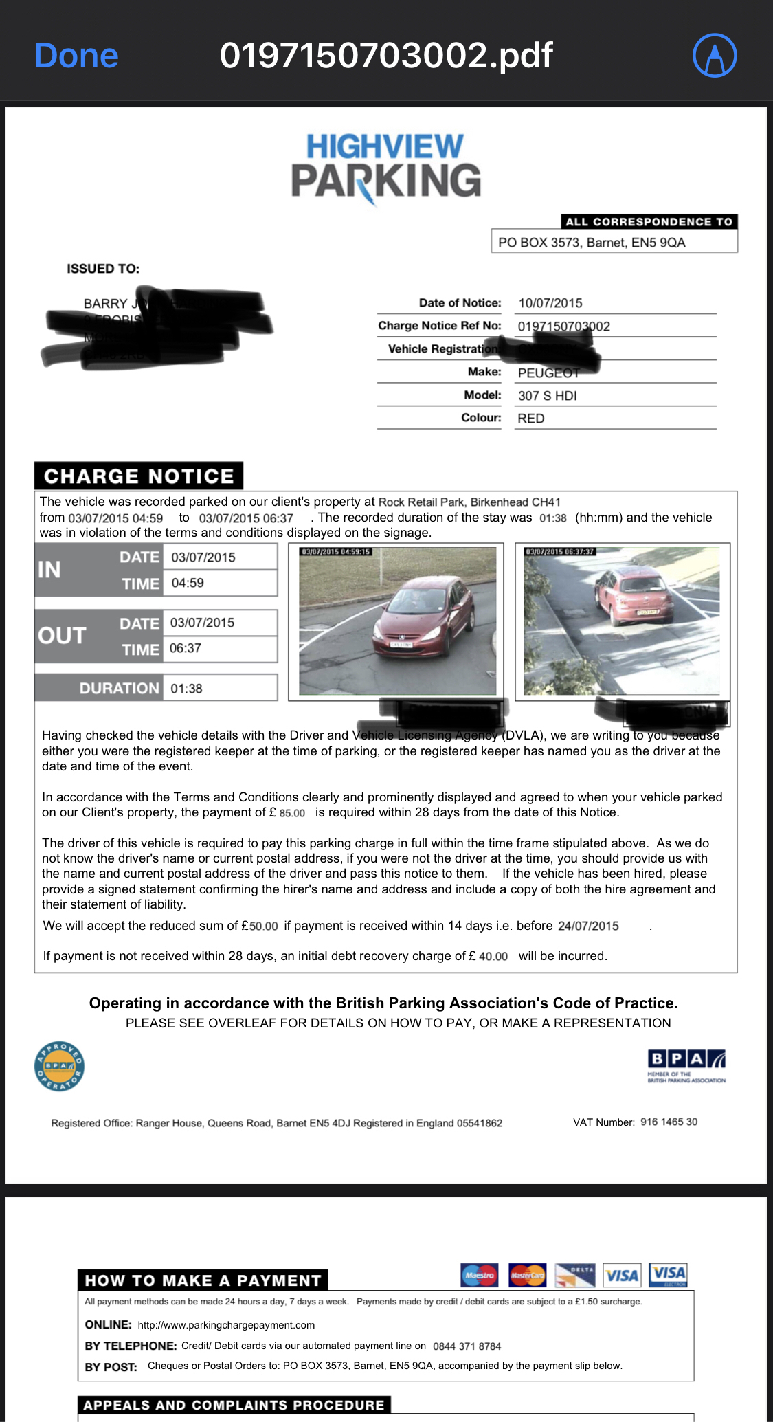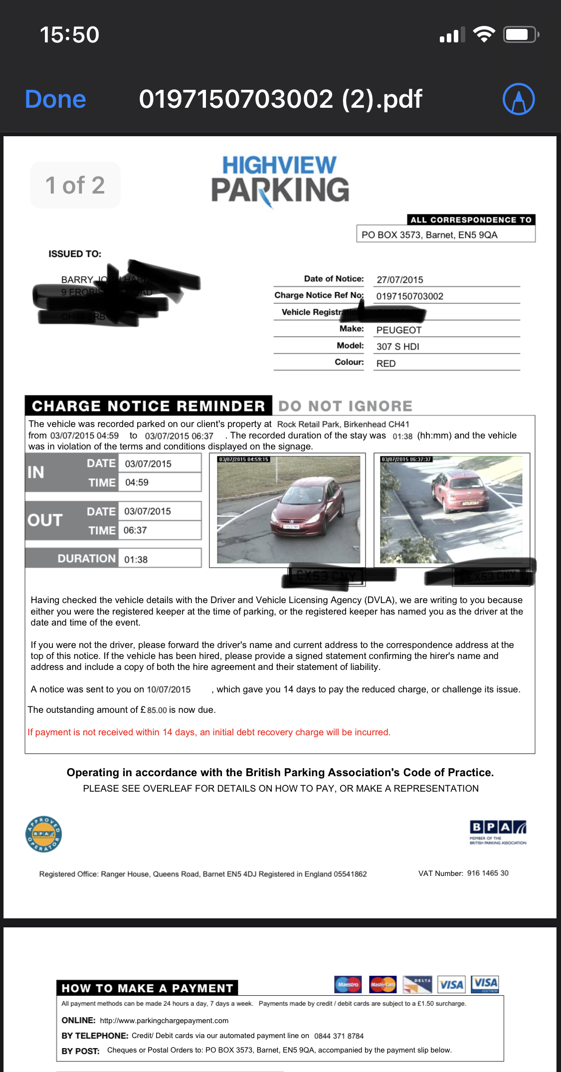3). The Defendant was issued with a Claim Form by DCB Legal acting on behalf of the Claimant Highview Parking Limited for a Total amount of £302.01 (inclusive of £25 Court Fee & £50 Legal representative's costs). Through research the Defendant has come to understand that this relates to a PCN that was issued against the Defendant’s vehicle ******* over 5 years ago on 3 July 2015 at The Rock Retail Park, Birkenhead.