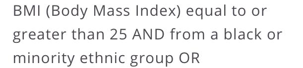ORA body mass index of 25 and from a black or minority ethnic groupORA body mass index of 25 with some comorbitiesIt therefore seems to me (though happy to be correct) that as I probably have a BMI of over 25 but I am white I do not qualify (I do not have any comorbidities and unlikely my bmi over 30).Is this how you read it?If so, is this discriminatory?I suspect they may be getting funding for this from somewhere related to health - and there is evidence that the BMI thresholds (crude as they are) are medically different for different ethnicities.Eg from:https://www.networks.nhs.uk/news/bmi-risk-thresholds-for-people-from-black-asian-and-minority-groups 'Healthcare professionals should consider a lower body mass index (BMI) when identifying the risk of weight-related conditions among people from black, Asian and minority ethnic groups, according to latest guidance from NICE. '