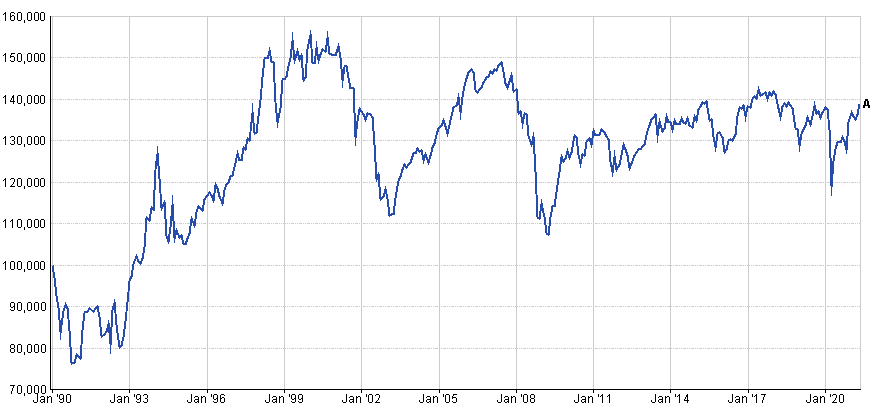 That is a chart that shows someone drawing 4.25% a year (0.36% per month) since Jan 90 based on sector average returns of the 20-60 shares sector (extra 0.25% to cover platform charge). If there was a dot.com style crash now (or near future) then this pot would likely start the cycle of falling values heading to zero as 20 years of inflation is unlikely to see the withdrawal amount being sufficient and there would be a need to increase it. Therefore speeding up the erosion. Indeed, the individual may have already had to start eroding the capital long before now. Or you may be lucky enough to have a frugel lifestyle where the state pension increases are enough or even better, a defined benefit pension with its annually increasing secure income along with the state pension.
