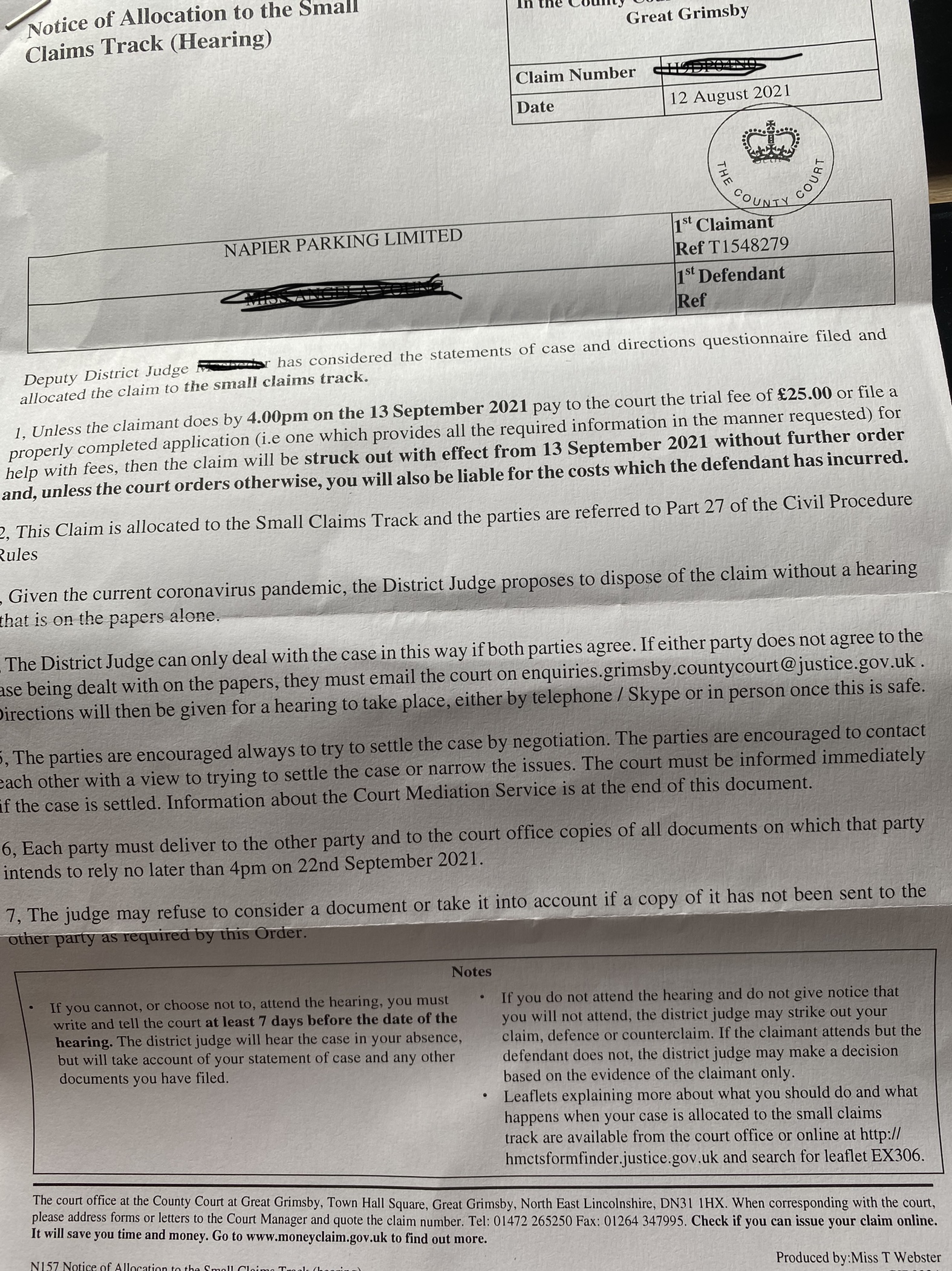 Hi All please see copy of recent letter received from the courts … I’m now panicking as I need to ensure I get organised … do you think this will go ahead ? I’m a little concerned as I used the template for a car park as opposed to a permit park and not long spotted that mistake … should I wait for Napier to pay the fees before doing anything ? Also should I submit all my photos:videos and letters disputing the fine ?