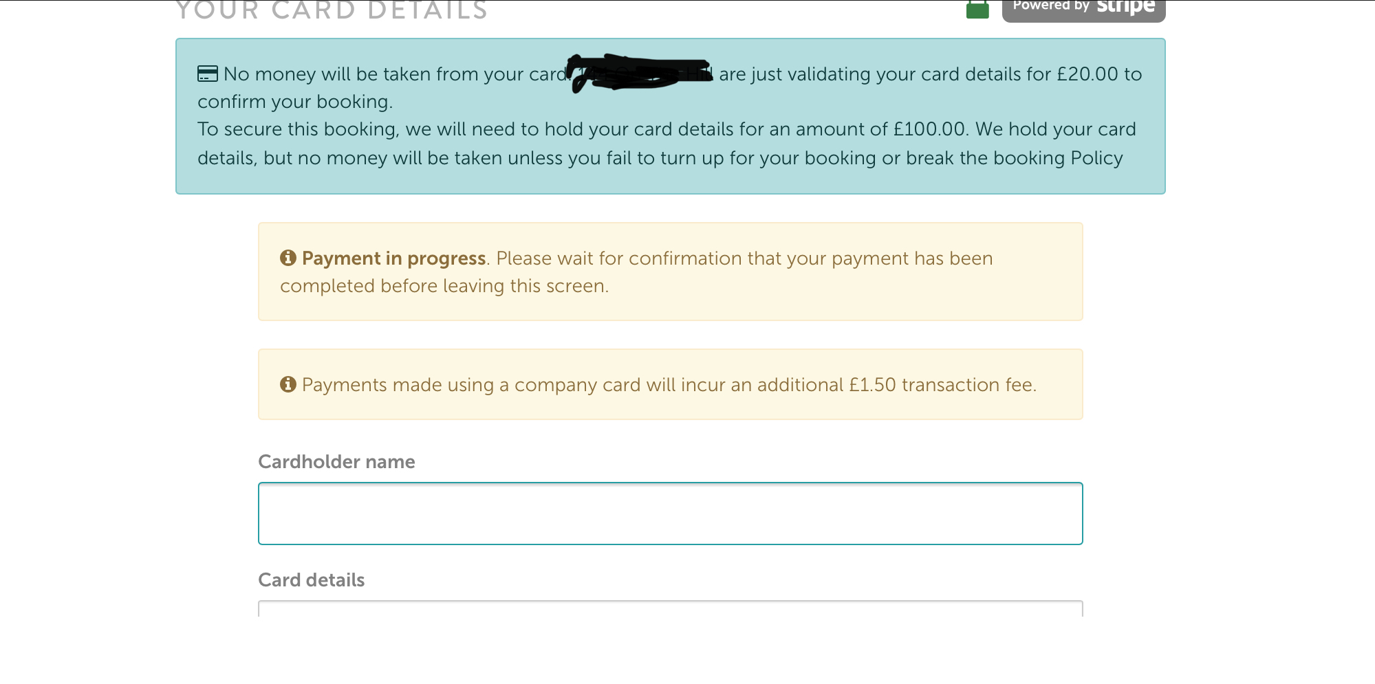 I am staying away for a few days next month. I tried to book a table in the hotel restaurant and on the booking page it says it will hold £20 just in case we don’t turn up. This is absolutely fine with me. So I went through to the payment page. Not only does it say they will hold £20 but they also want to hold an additional £100! This is a ridiculous amount to me. Especially since it will be pending on my account for over a month.