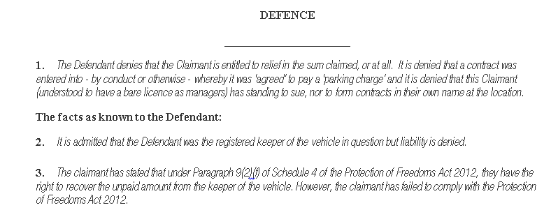 Defence:1. - The claimant has stated that under Paragraph 9(2)(f) of Schedule 4 of the Protection of Freedoms Act 2012, they have the right to recover the unpaid amount from the keeper of the vehicle. However, the claimant has failed to comply with the Protection of Freedoms Act 2012.Under the conditions that have to be met for the right to claim unpaid parking charges from the keeper of the vehicle (Paragraph 4), Paragraph 7(2)(f) states that the notice to the keeper must 'specify the vehicle, the relevant land on which it was parked and the period of parking to which the notice relates.' The claimant has failed to specify the period of parking. The PCN states a time of 13:27, which is not a period of time.2. - Following a subject access request, the defendant was able to calculate the duration of time that the vehicle was parked via the photo timestamps. The first photo is timestamped at 13:24:24 and the final picture timestamped at 13:26:42. The total duration between the two photos is 2 minutes and 18 seconds which is not sufficient time to learn of the terms; that may have included enquiring with the premises/resident as to how to obtain the permit that the sign vaguely mention.3. - The photographic evidence of the front of a vehicle windscreen, obtained via the subject access request, does not clearly show that the photo in question is of the defendants vehicle. There are no identifying features in this photo that suggest it is of the defendants vehicle, such as a number plate or vin number.4. - The photographic evidence provided shows the vehicle situated in an area with no clear marked bays; therefore, it has not been made clear and obvious where the claimant constitutes where drivers are made liable for parking charges.0 -