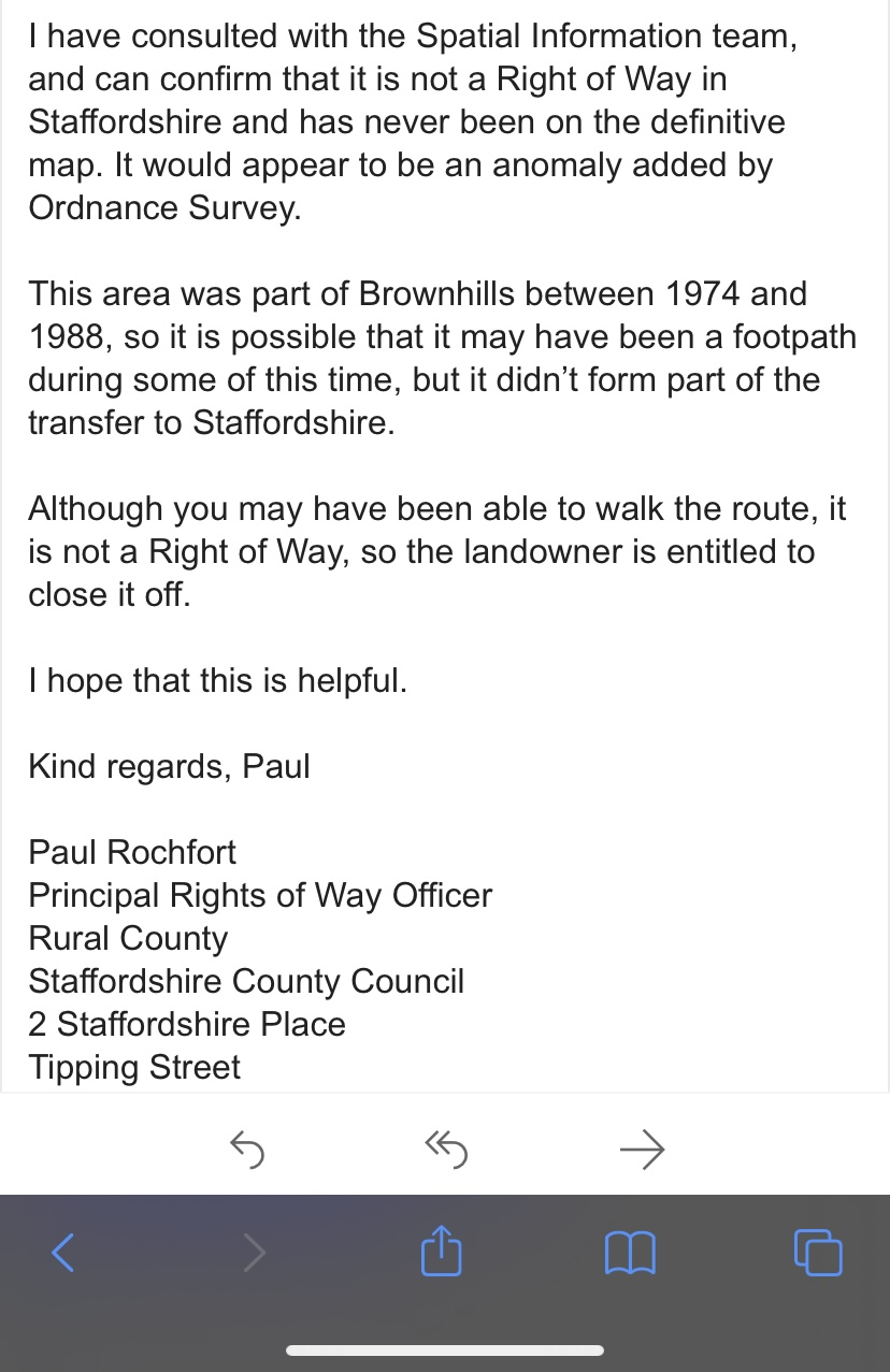 I haven’t personally used it for that long, possibly 6 years at the most but I know of neighbours who have used it for a lot longer. I will need to ask them as the M6 toll road was built through the land immediately behind this and this might be why the right of way wasn’t recorded.MattMattMattUK said:Unless you can demonstrate that you used the route regularly for at least 20+ years and that there were not "No public right of way" signs there you have nothing to complain about. You do not have a right to walk on someone else's land unless there is a right of way.0