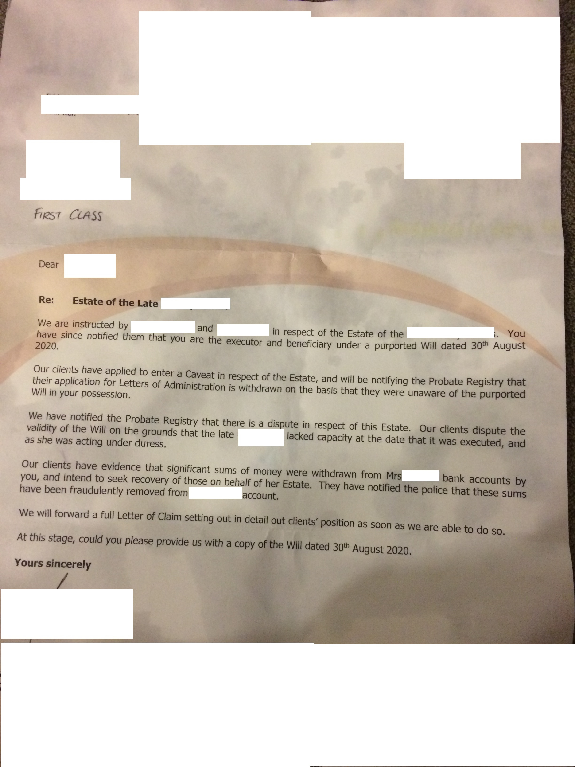 Managed to read the will posted earlier and in all of my life drafting wills and witnessing will for clients I have never once seen a paragraph suggesting that anyone contesting a will, will be written out of it. No idea where you found the wording for it but big mistake I'd say.