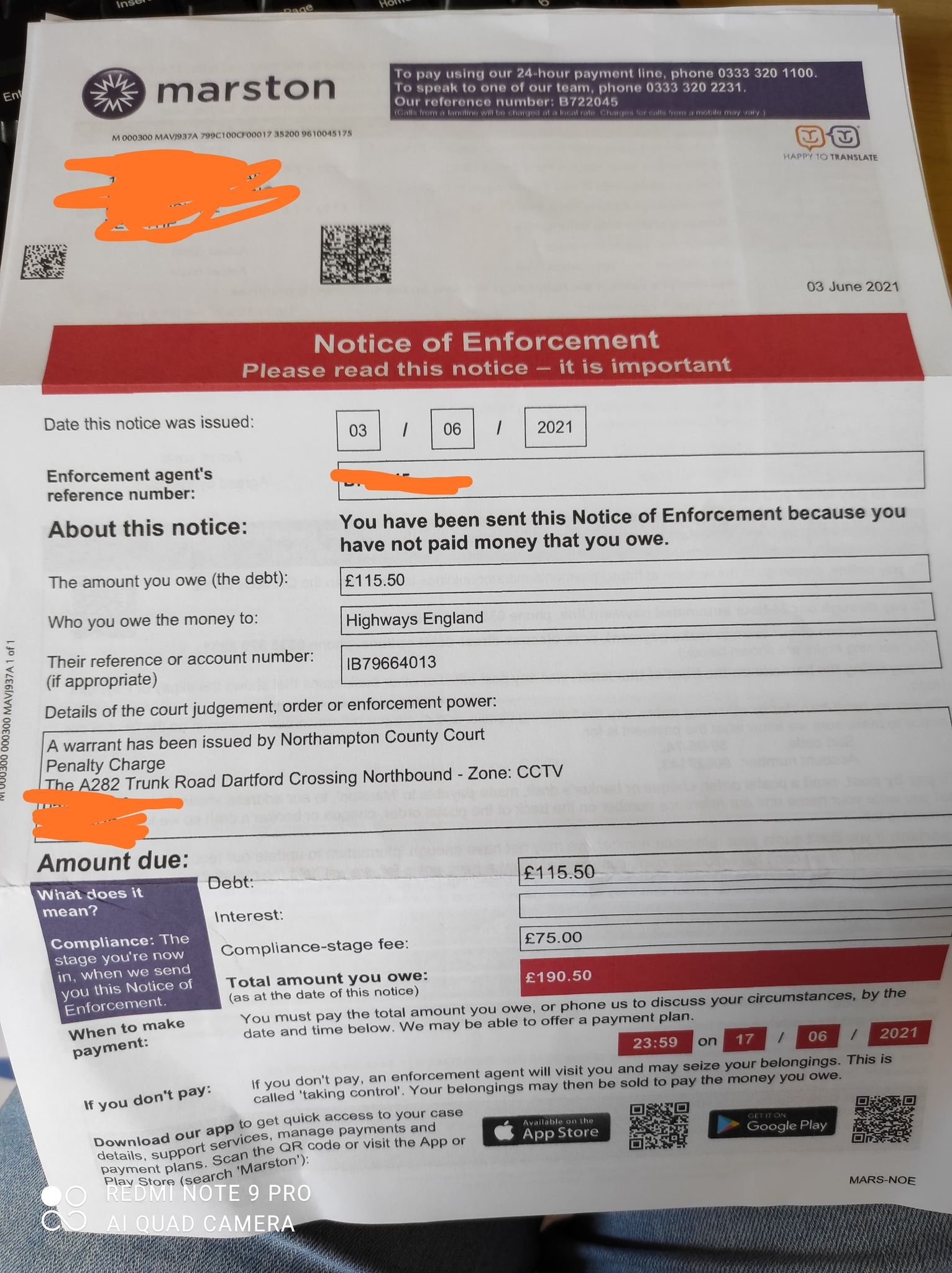 These are live enforcements with a warrant and bailiffs will be coming knocking, so you need to hide your (other) car - no vehicle on the driveway or they can clamp it - and have your paperwork proof ready to show the bailiffs that you sold the car on xx date and that you've told Highways England this already. Proof.PRIVATE 'PCN'? DON'T PAY BUT DON'T IGNORE IT (except N.Ireland).