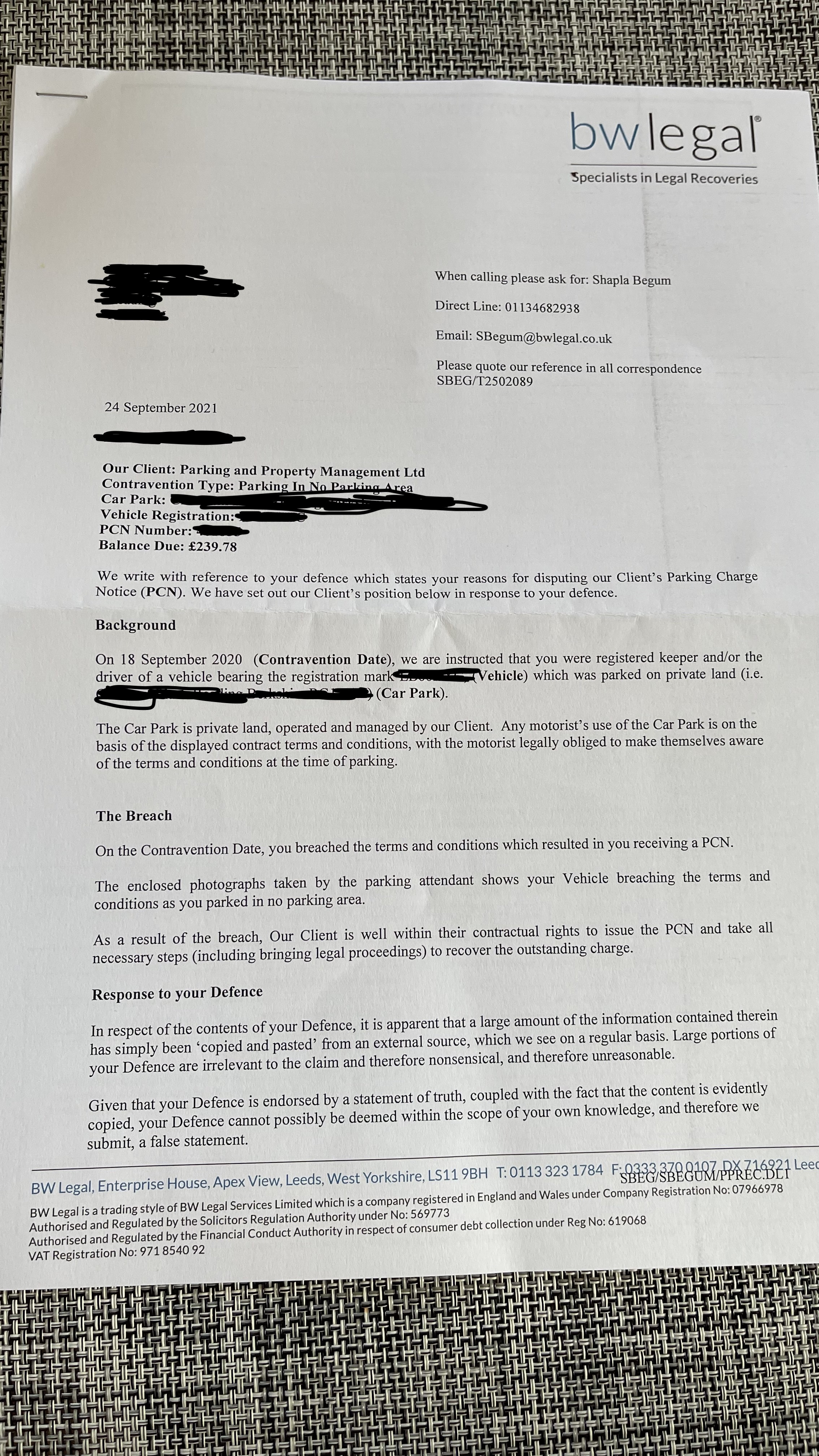 What intimidating twaddle, trying to get people to withdraw their defence because BW Legal (but no Judge ever) thinks it is a 'false statement'.PRIVATE 'PCN'? DON'T PAY BUT DON'T IGNORE IT (except N.Ireland).