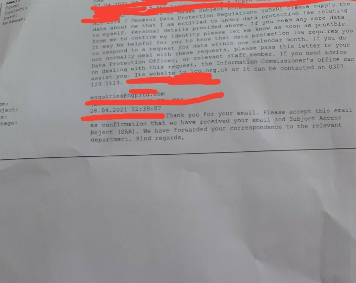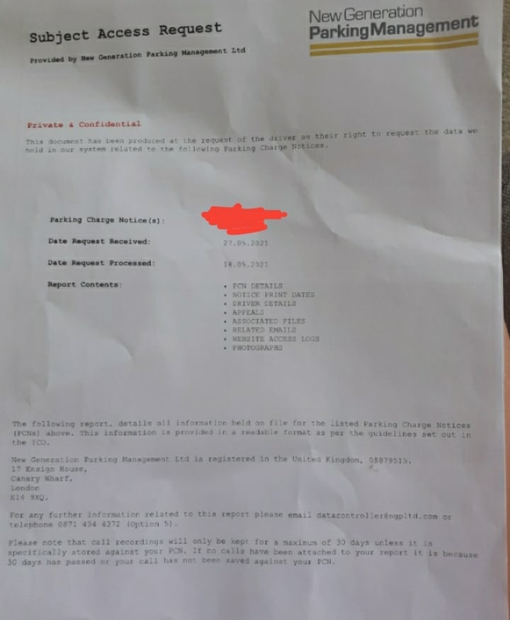 Thank you! Took your advice and emailed them the following (without the friendly undertones!)Redx said:the point here is how can their client possibly expect to have an invoice that needs paying, if they cannot produce that invoice ? ( the NTK PCN being the disputed document )good luckDear SirsAs you are aware from my email dated 27 April 2021, I made an SAR to your client New Generation Parking Management Limited.I recieved a response from your client yesterday (22/05/21) and the information provided is insufficient and incomplete, as a consequence i would request that you speak to your client to ensure that the SAR request is completed in full. This would include providing copies of any letters sent in relation to the PCN invoice and other documentation relating which I have not been provided with. I would also request that the matter is put on hold until I am in receipt of all information relating to the claim. I am seeking legal and financial advice and this information is required and is my right. I would prefer this information electronically as I was required to pay the insufficient postage costs from your client (I also have evidence of this).I have included pictures of the limited information provided by your client for your reference and this total lack of compliance will come up in any court proceedings. Please note that a failure to comply with my request in full including providing the original NTK (which at the time would have been the lease company) will result in an escalation to a complaint to the ICO for non compliance with the SAR request.Yours Faithfully1 -
