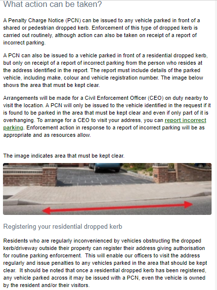 That's absolutely brilliant!TooManyPoints said:My local authority is more than helpful when it comes to the enforcement of dropped kerb obstruction. Here's s snip from their website on the matter. Note there is no distinction between properties that have a vehicle on the front lot and those that don't. In my own particular road there was a spell where a number of householders had access to their property restricted by inconsiderate parking and the LA blltzed the road for a week, which saw an end to most of it.