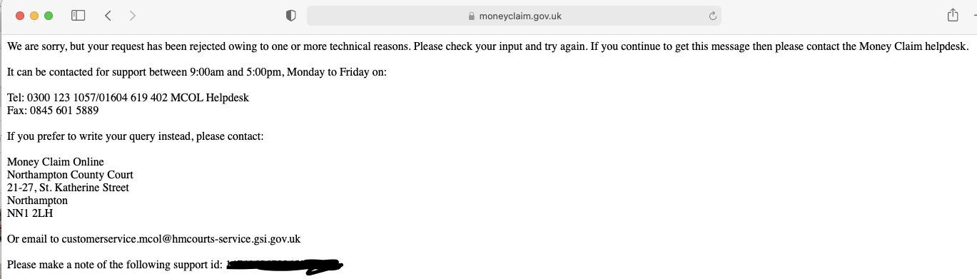 So i went onto the money claim website to submit the Defence but after copying and pasting it into the free format box I am getting the below error message (see screenshot) when clicking "next." Tried several times on different browsers and even deleting the current Defence and starting a new one but still the same error message. I have emailed the customer service email address to report the issue so hopefully they'll get back to me tomorrow. I will probably try ringing them too.- Has anyone else faced this issue?