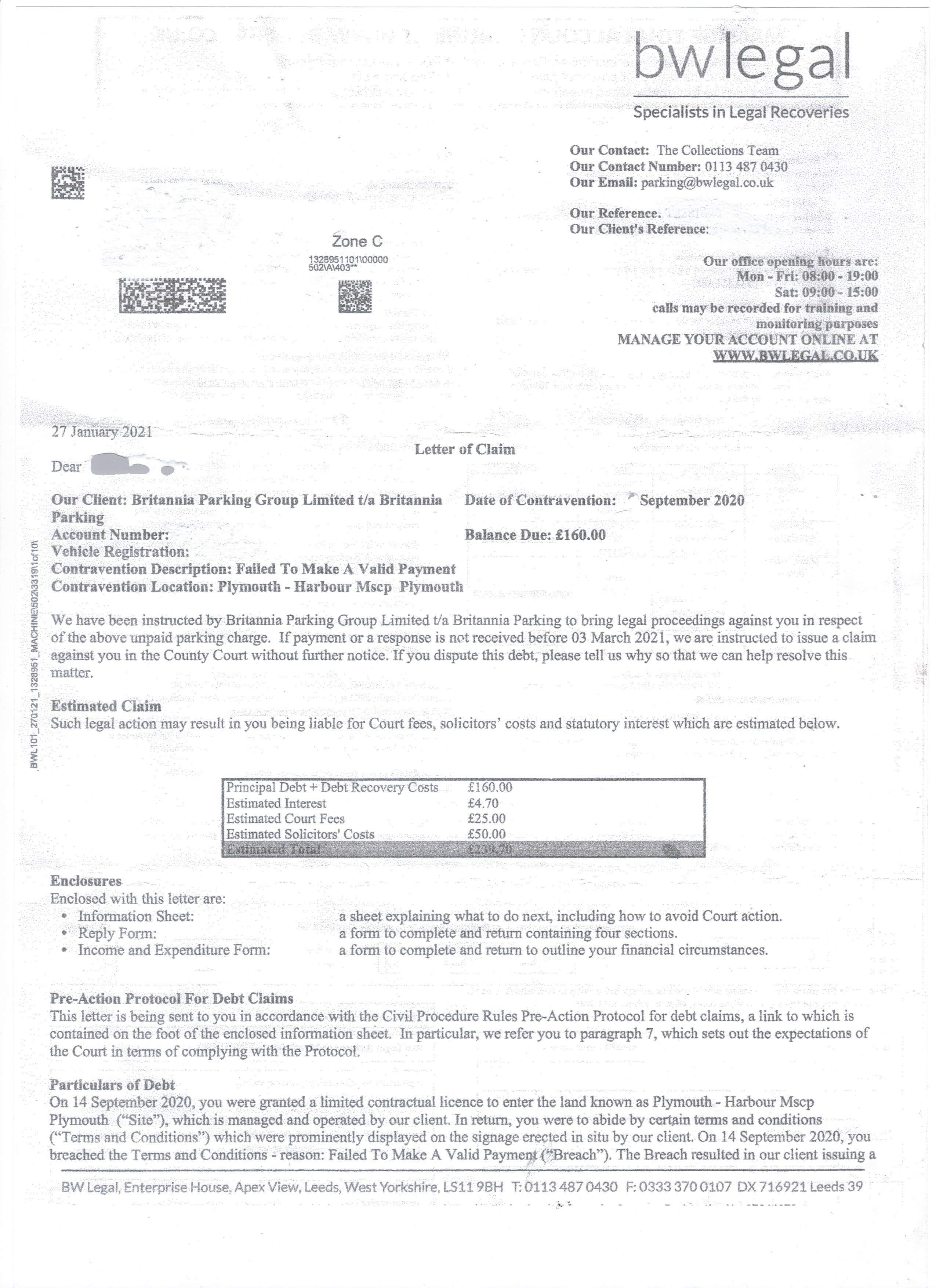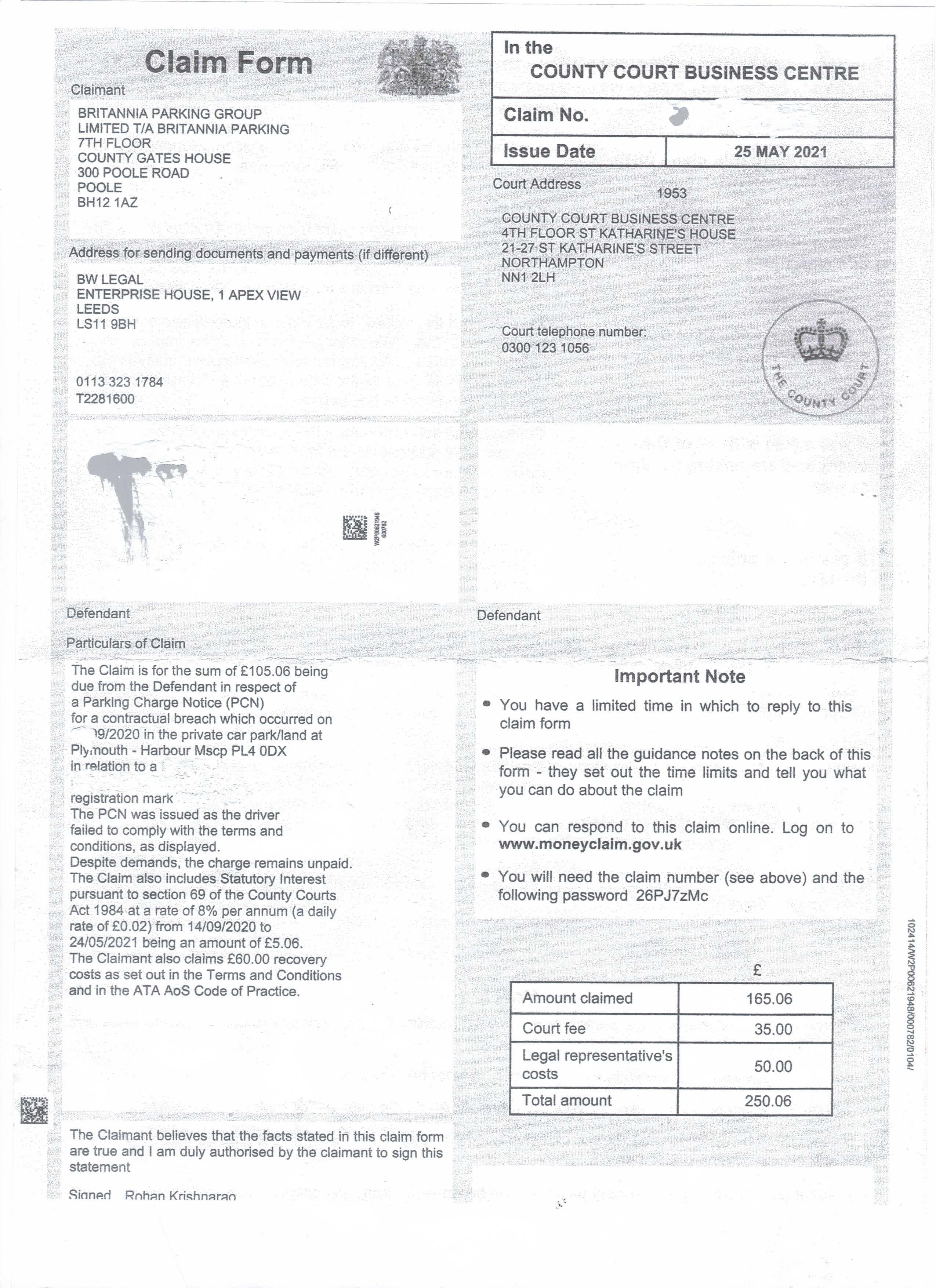 One very important thing to determine is the precise name of the PPC by comparing the name on the signs with the name on the NTK/court claim. Britannia has two separate entities with slightly different names, and different company numbers.